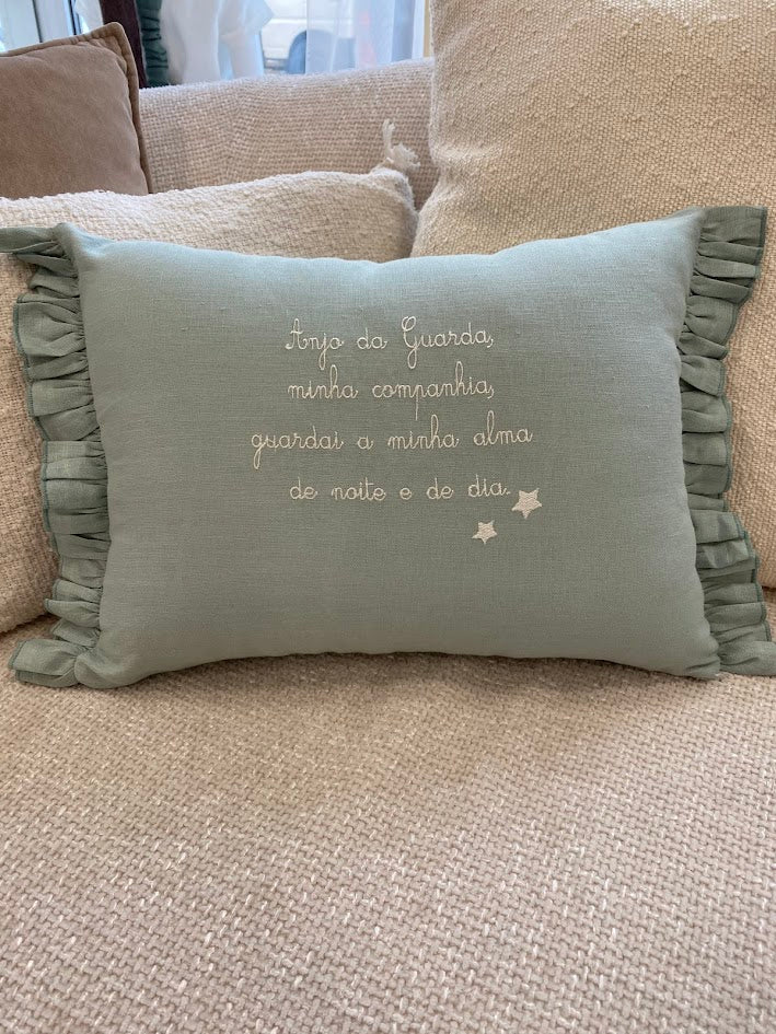 Rectangular pillow with delicate ruffles and an embroidered Guardian Angel prayer. A meaningful detail for a baby's room or as a souvenir for special occasions like baptisms and communions. Its elongated shape lends it elegance and versatility, making it perfect for both decoration and comfort.