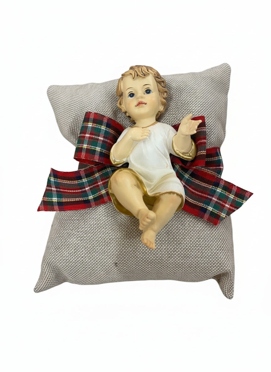 A almofada em tecido neutro vem com enchimento macio, pronta a colocar onde desejar. A figura do Menino Jesus apresenta expressões delicadas, detalhes pintados à mão e contornos dourados. Laço em fita xadrez vermelha, verde e azul, com acabamento cuidado e resistente.