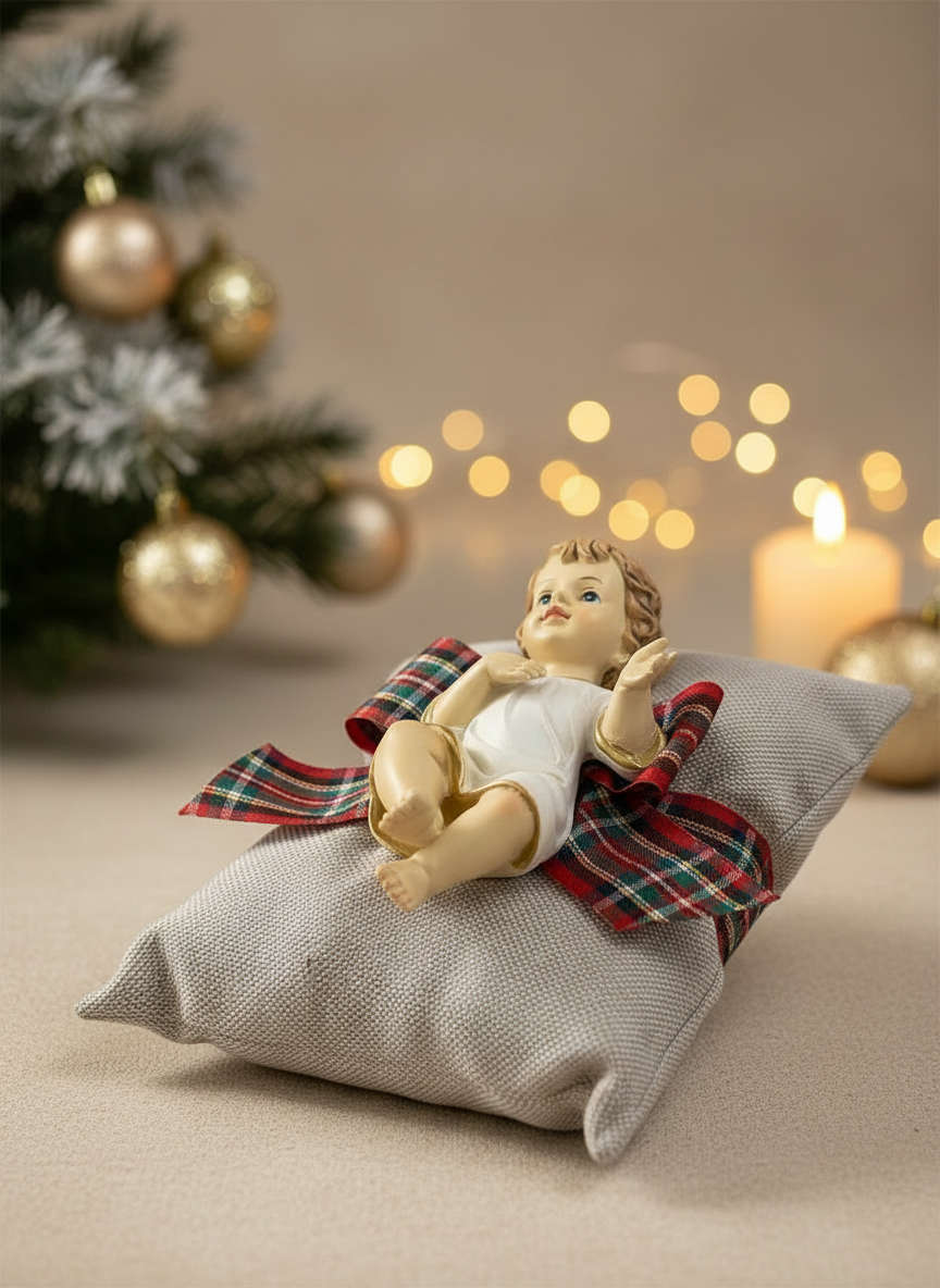 Nesta delicada almofada decorativa, o olhar doce do Menino Jesus convida à paz e à oração. A figura, ricamente trabalhada em tons marfim e dourado suave, repousa sobre tecido bege de textura elegante, enquanto o laço em xadrez natalício acrescenta um toque clássico e festivo. Cada pormenor transmite ternura, devoção e acolhimento, criando uma peça que reúne tradição e beleza, pensada para acompanhar os momentos mais íntimos das celebrações de Natal.