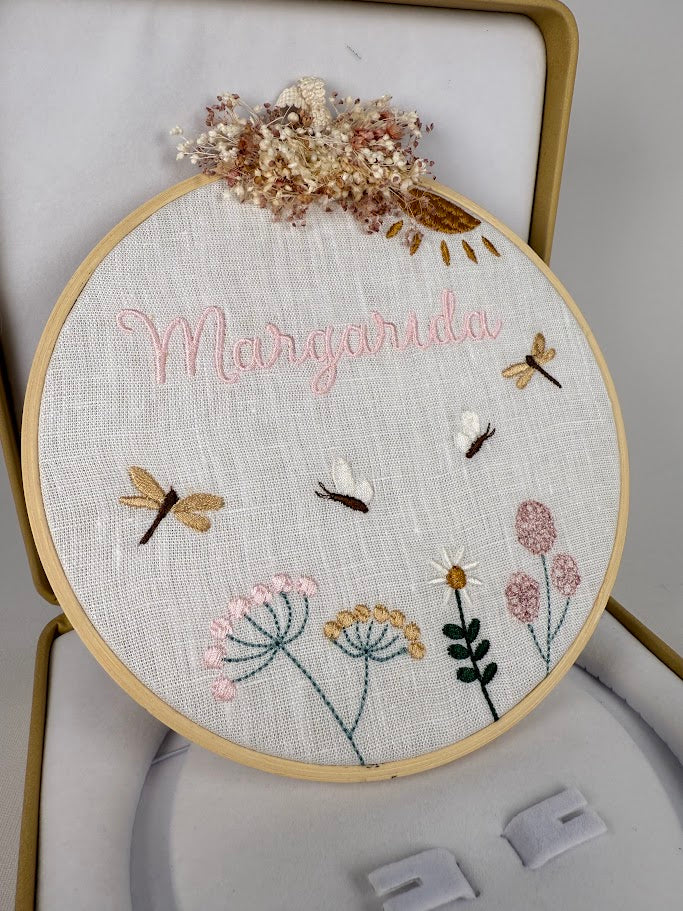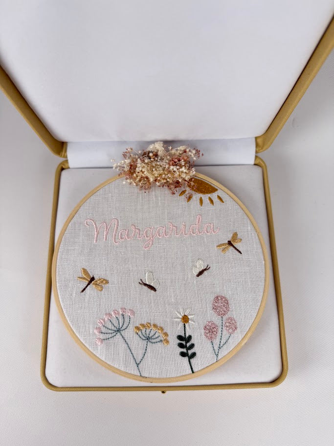 This personalized frame from Atelier Hábitos de Geração is a handcrafted piece full of tenderness and poetry. Embroidered with the child's name , it features a delicate scene of wildflowers, dragonflies, and bees , seemingly dancing over the field in a light and harmonious movement. At the top, an arrangement of preserved flowers adds a natural and romantic touch, making each creation truly unique.
