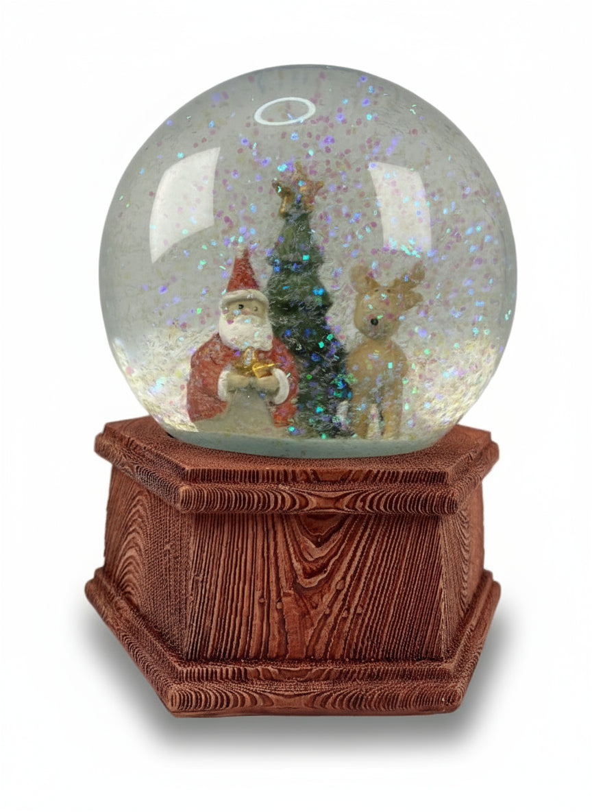 This delicate musical water ball is a celebration of Christmas dreams and memories. Inside, Santa Claus and a reindeer stand beside a lit tree to create an enchanted scene, which comes to life when the ball is shaken, revealing a soft, sparkling snowfall . The carved wood-tone base adds a rustic and welcoming touch, while the soft melody evokes the warmth and nostalgia of the holiday.