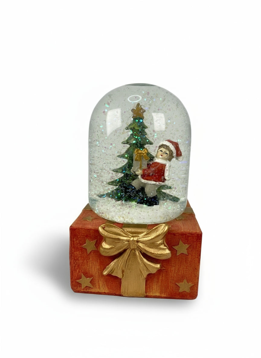 This charming water ball with a gift-shaped base is a tribute to the joy and whimsy of Christmas. Inside, a festive figure next to a Christmas tree comes to life amidst sparkling sparkles that dance as it's shaken, creating a spectacle of color and excitement. The red and gold base, adorned with stars and a sculpted bow , adds an elegant and festive touch, perfect for brightening up any corner of the home.