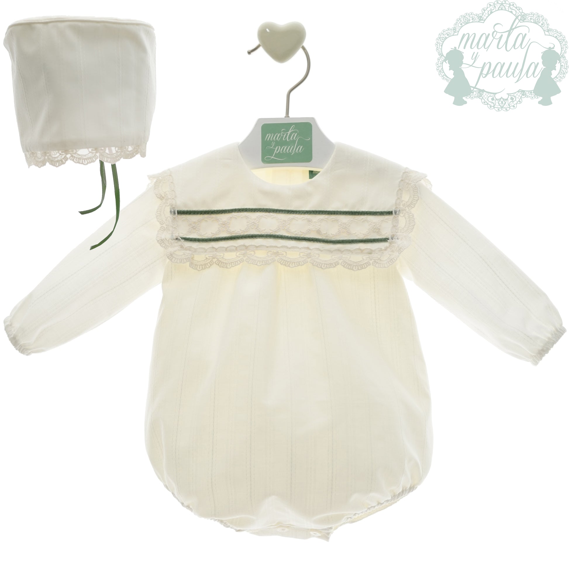 Ivory baby costume with delicate lace details and olive green ribbons on the brim. Includes a matching bonnet, both with fine lace trim for charm and tradition. A refined piece, ideal for baptisms and special occasions.