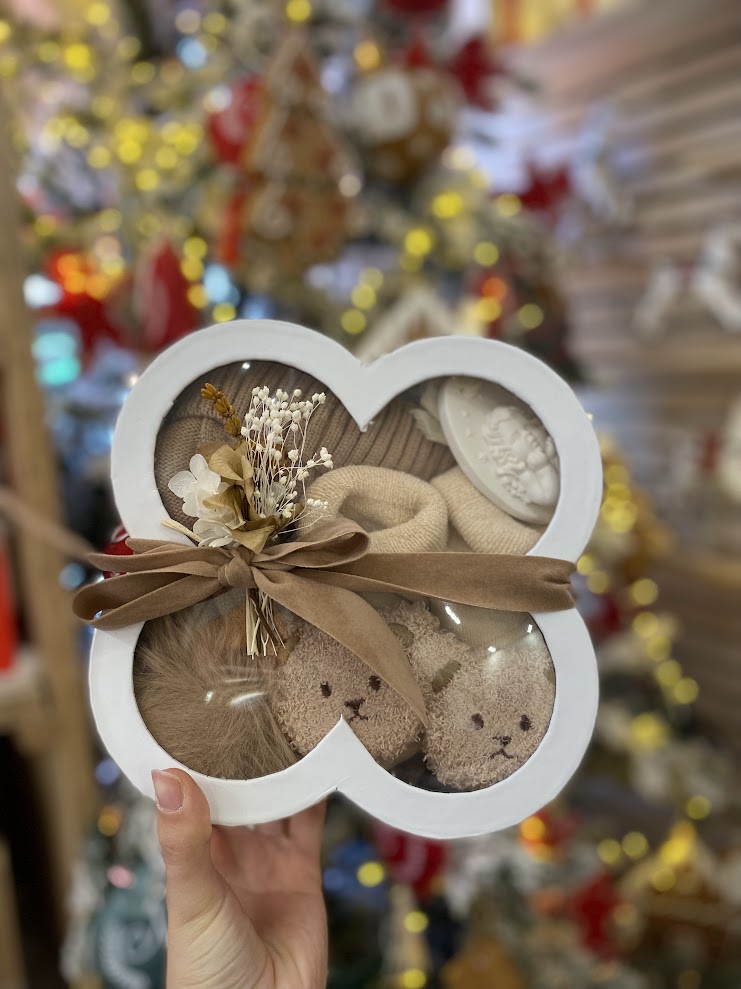 An elegant and delicate box, accompanied by a small bouquet of preserved flowers, ideal for a tender gift. Inside, there is a pair of soft and comfortable socks in neutral tones, perfect for keeping little ones warm, a charming hat that combines functionality and charm, and a delicate perfumed plaster, which releases a soft and welcoming fragrance. Every detail has been carefully thought out to convey affection and care, making this box a unique and special keepsake.