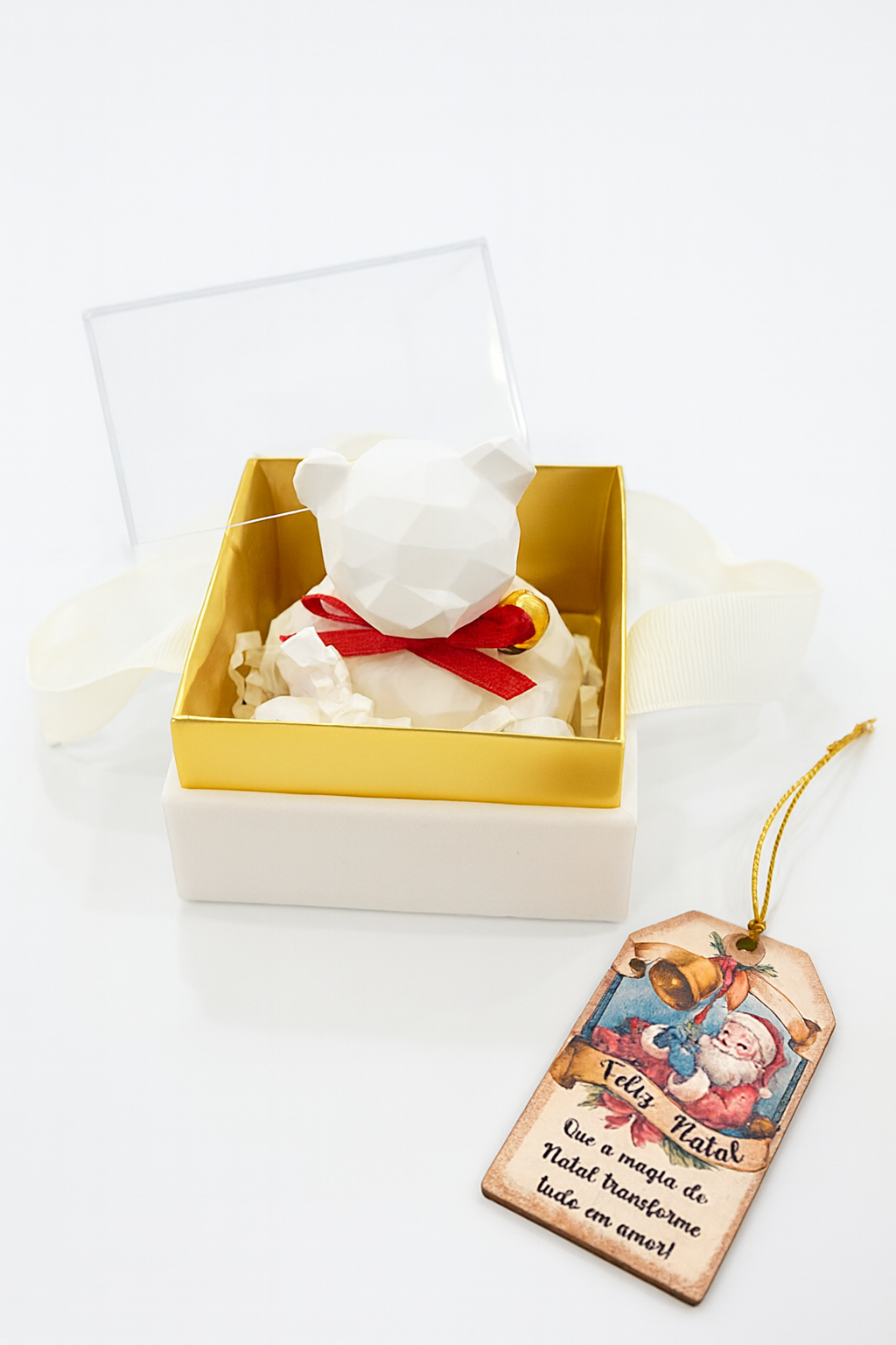No interior, o urso em gesso vem acomodado em enchimento decorativo, pronto a oferecer. A caixa apresenta acabamento elegante em dourado e base em tom neutro, ideal para combinar com diferentes estilos de decoração natalícia.