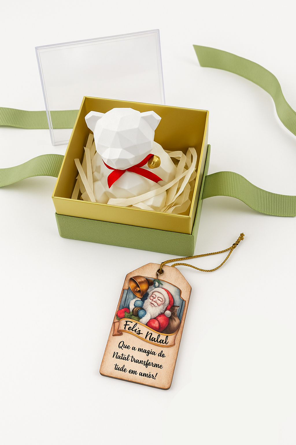 O encanto desta caixa presente revela-se num adorável urso em gesso branco, de linhas facetadas e look contemporâneo. A fita de cetim e o pequeno sininho dourado acrescentam brilho festivo, enquanto a caixa rígida em tons suaves, com tampa transparente, transforma o conjunto numa peça de decoração tão bonita quanto simbólica. Um mimo pensado para surpreender com ternura, onde cada detalhe convida a abrandar e a viver o Natal em família com mais calma, beleza e emoção.