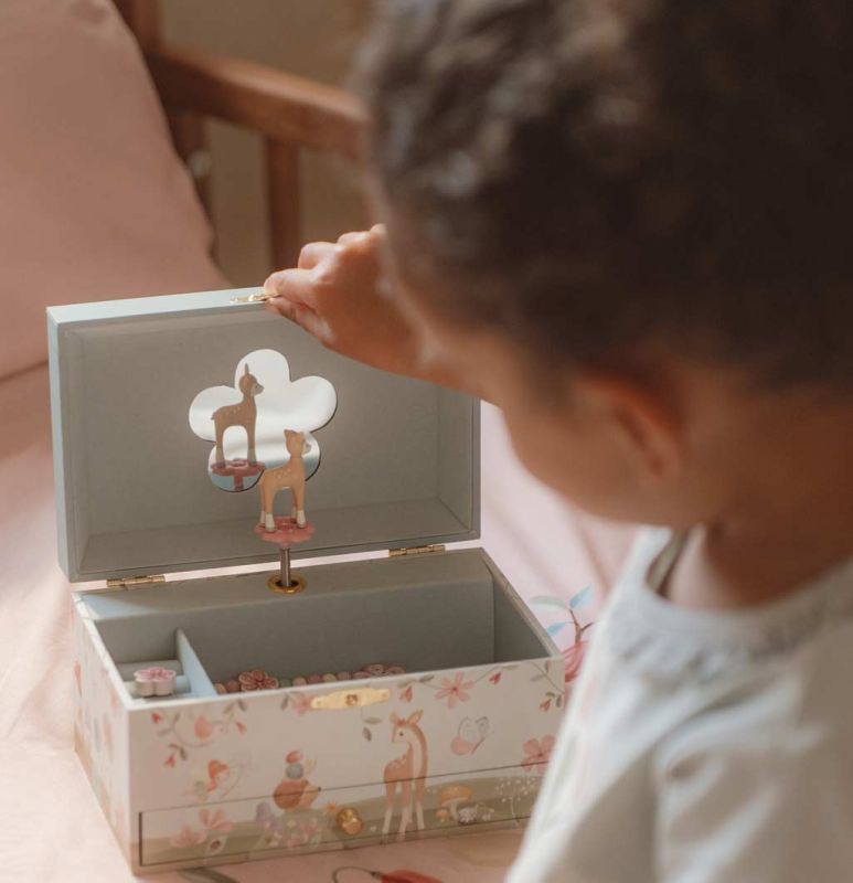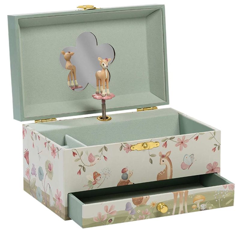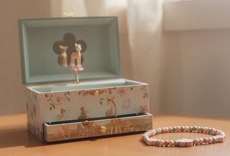 Make your little one happy with their very own musical jewelry treasure box! This colorful box, featuring adorable Forest Friends, offers plenty of space for the prettiest jewelry or other precious items. Once you wind it up, the music plays as you open the box, and a little deer starts dancing in front of the mirror. This is the perfect gift that your little one will treasure for a lifetime!