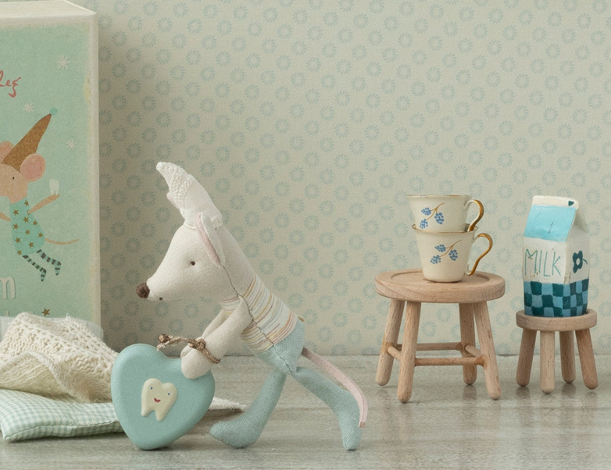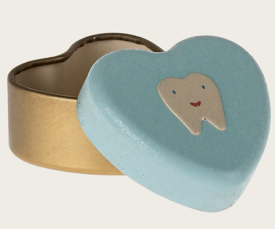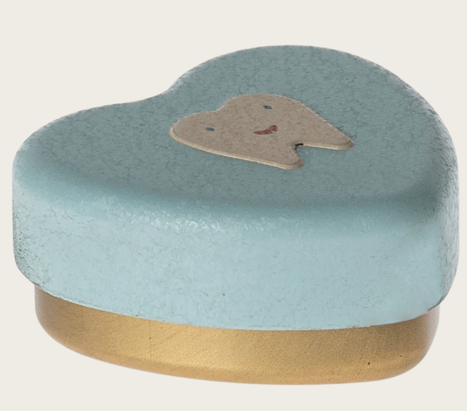 This charming heart-shaped box from Maileg is the perfect place to preserve those first baby teeth and immortalize the sweetest childhood memories. Made of sturdy metal , it features a gold interior and a soft mint lid, featuring an adorable, embossed smiling tooth that conveys tenderness and joy. The special surface texture gives it a delicate, handcrafted touch, typical of the Danish brand's timeless charm.