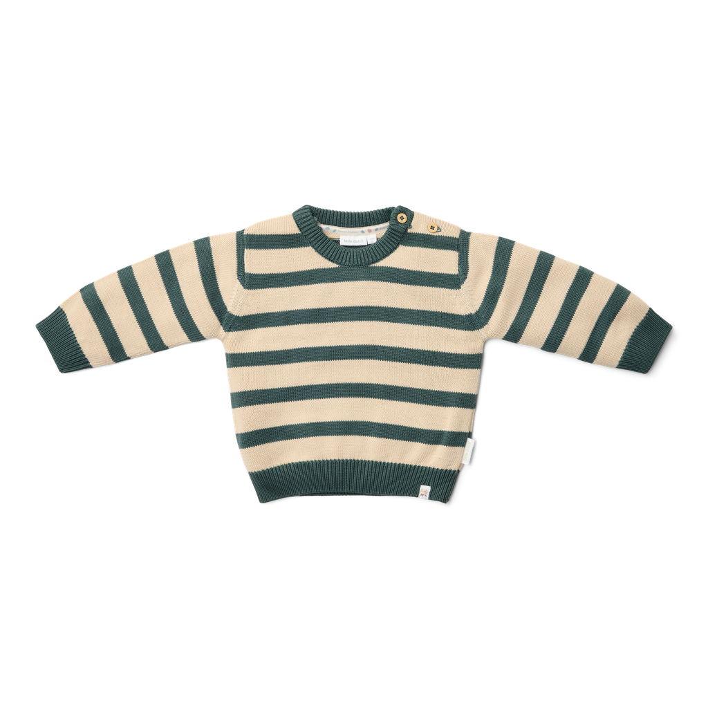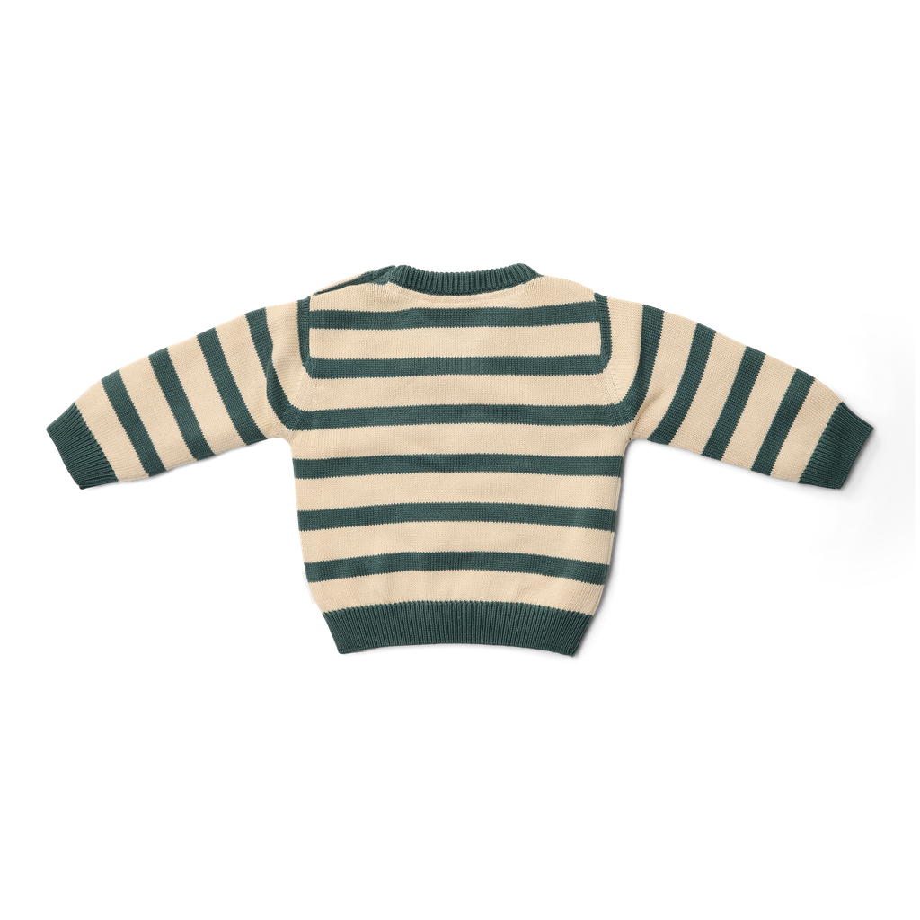 Soft knit sweater with a green and beige striped pattern. Long-sleeved, crewneck, and side button opening at the shoulder make it easy to put on. A comfortable and easy-to-wear classic for everyday wear.