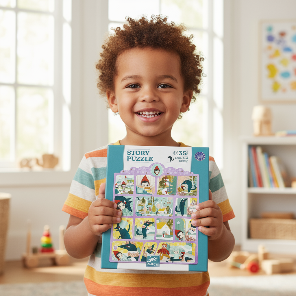 Djeco's "Little Red Riding Hood" Jigsaw Puzzle is a delightful introduction to the world of classic tales. With 35 pieces made of sturdy cardboard , this puzzle reveals the famous story of Little Red Riding Hood in the form of a silent comic strip , where the images narrate the adventure with tenderness and color. Detailed and expressive illustrations stimulate imagination, concentration, and the joy of discovery .