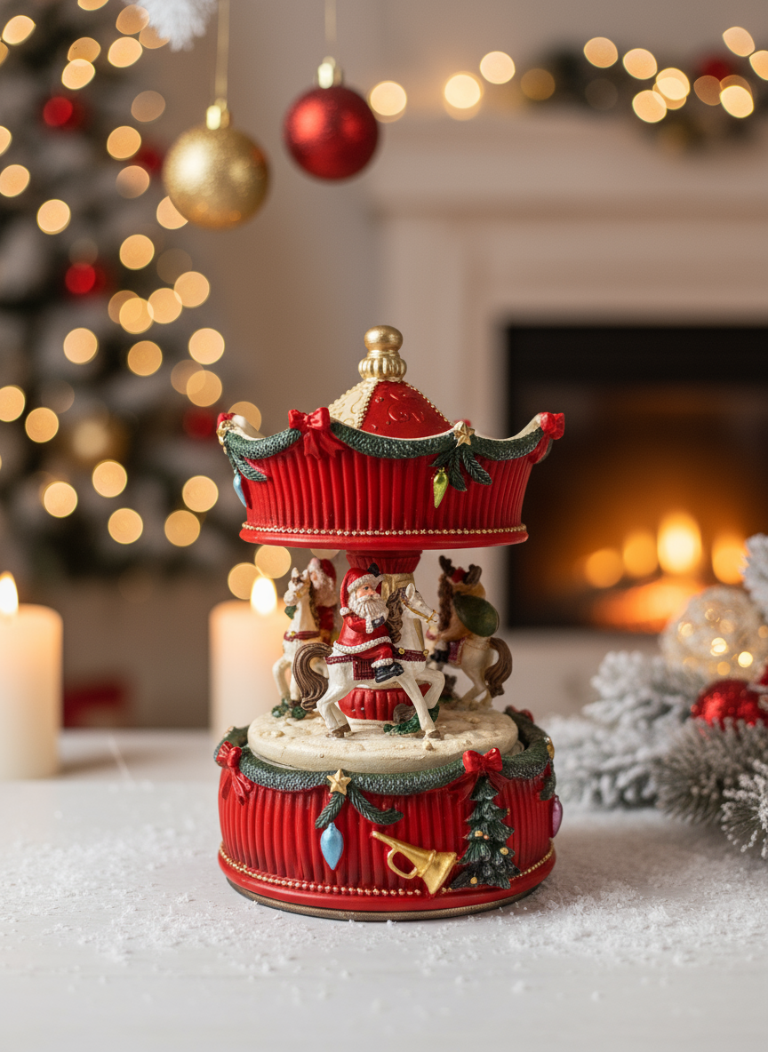 This Christmas Musical Carousel enchants at first sight with its classic and detailed design. In shades of intense red, gold, and snow-white , it features small festive figures that gently rotate to the sound of a Christmas melody. Made with durable materials and meticulous craftsmanship , it evokes the charm of traditions and the warmth of family memories. Every detail, from the ribbons to the horses, reveals the care and celebratory spirit that defines this piece.