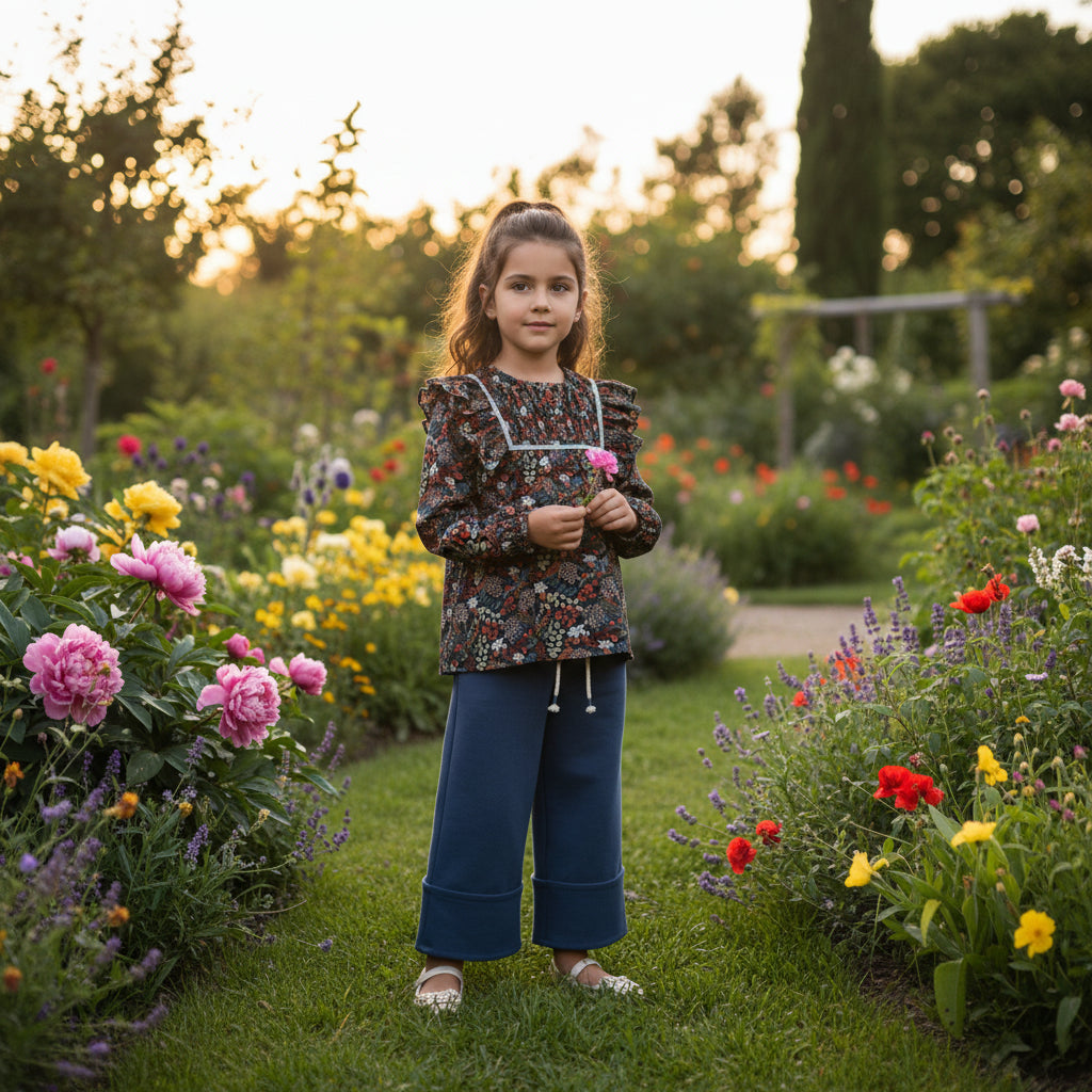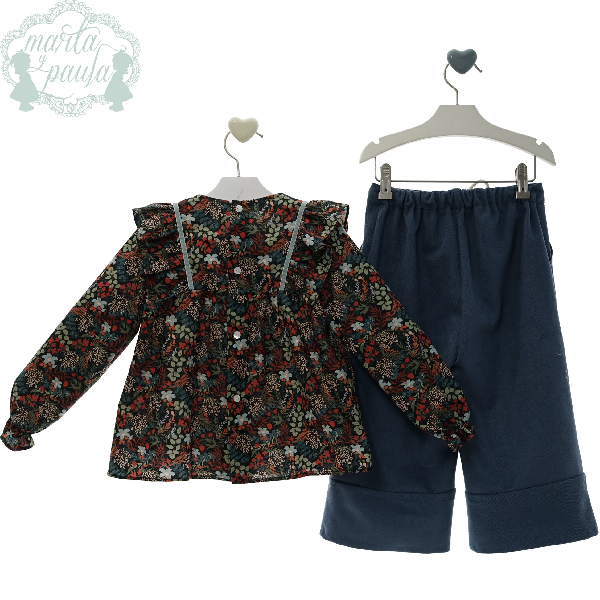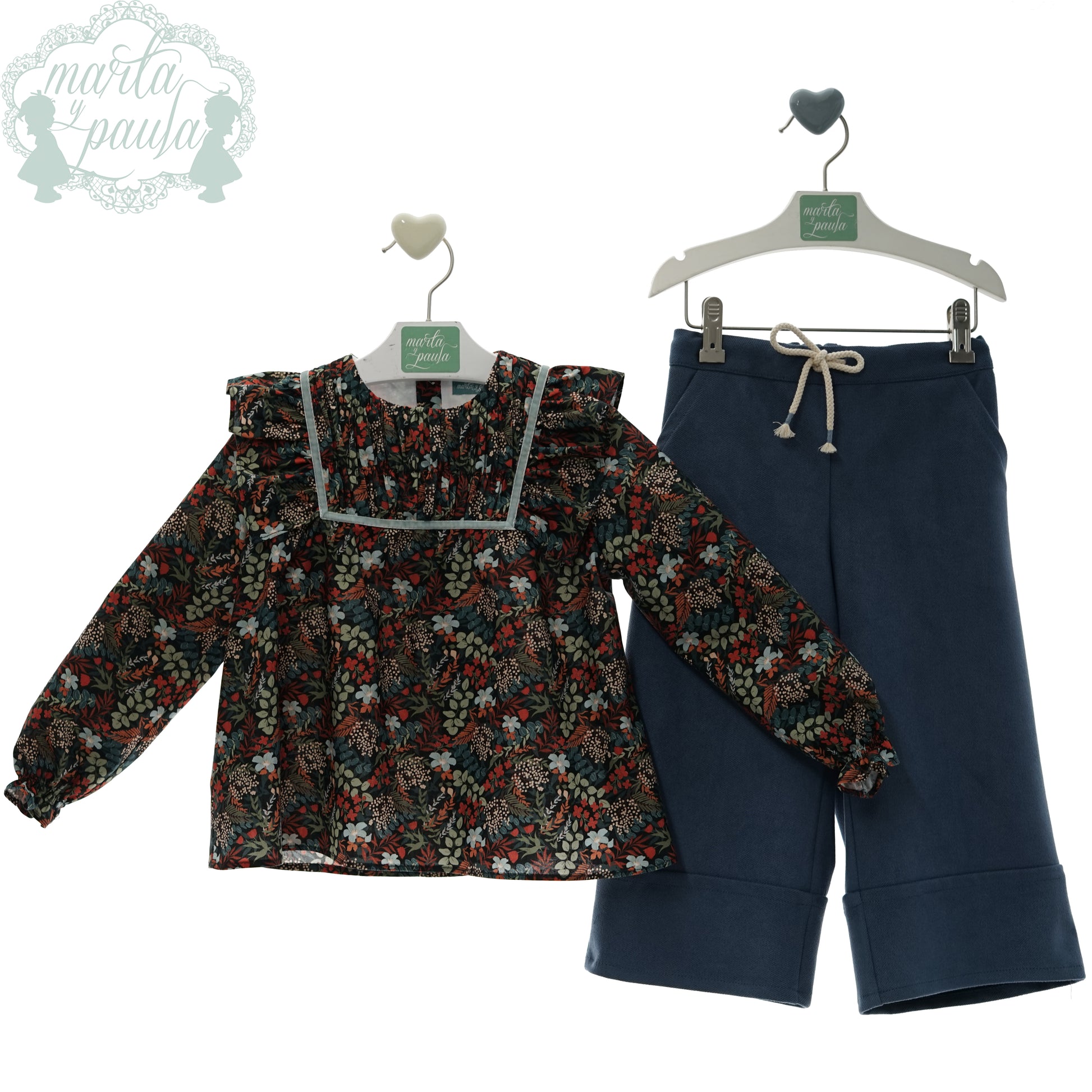 This Marta y Paula ensemble combines classic romanticism with the natural elegance of the colder seasons. The floral-print blouse blends shades of green, blue, red, and gold , evoking the soft hues of autumn. The ruffled chest and white lace detail add a poetic, handcrafted touch, while the navy blue pants , in a soft, flowing fabric, ensure comfort and freedom of movement . The adjustable tie at the waist completes the look with sophistication.