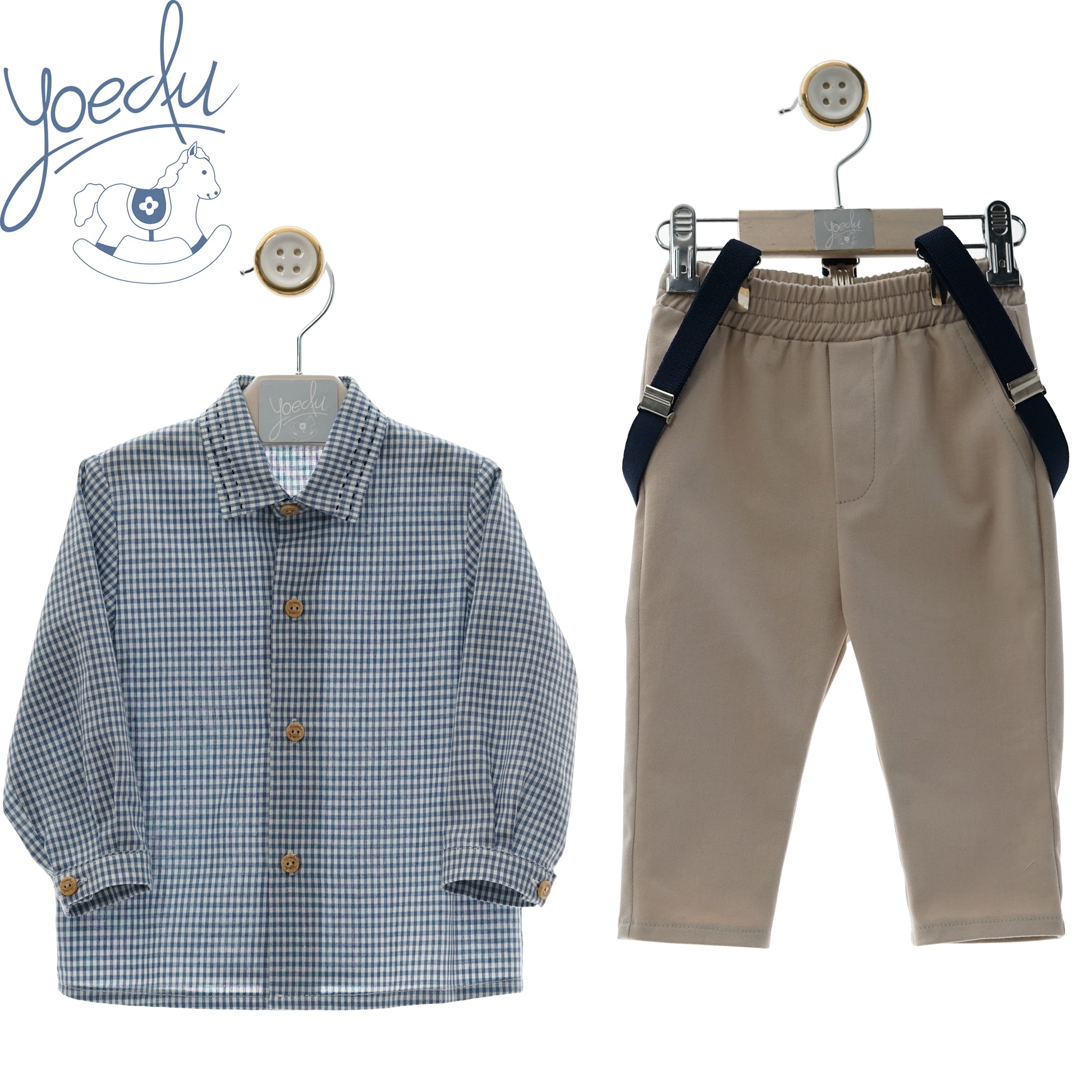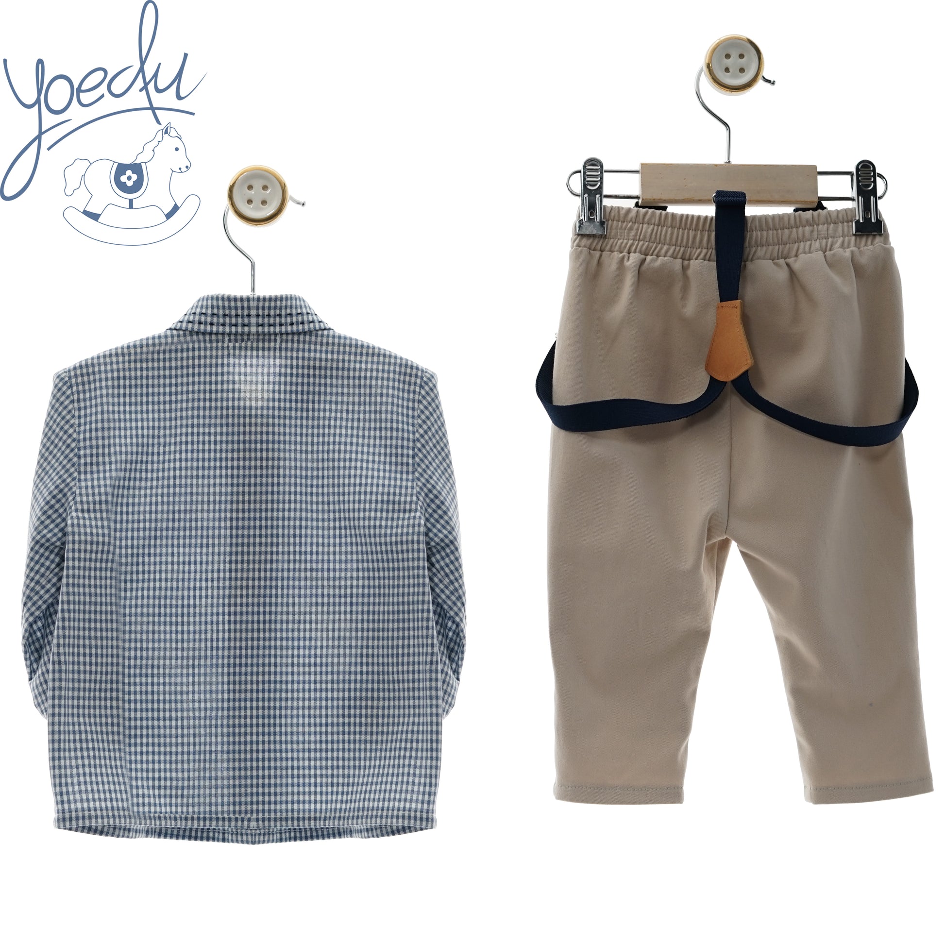 Men's ensemble consisting of a long-sleeved blue and white gingham shirt, paired with beige pants with an elastic waistband and detachable navy blue straps. A practical and elegant choice, ideal for ceremonies, outings, and special occasions.