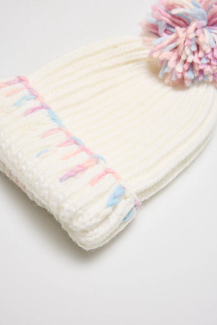 The hat, made from a soft and cozy fabric, wraps you in warmth and comfort, while the multicolored pompom adds a touch of fun and style.