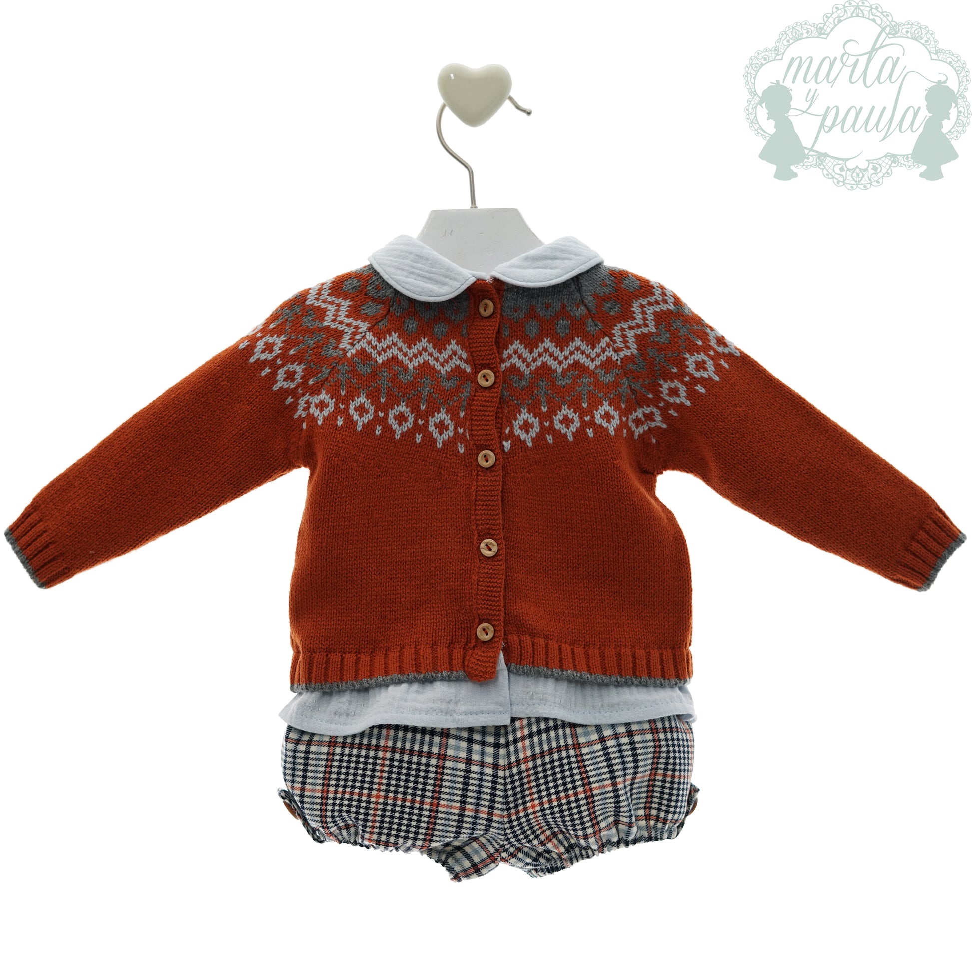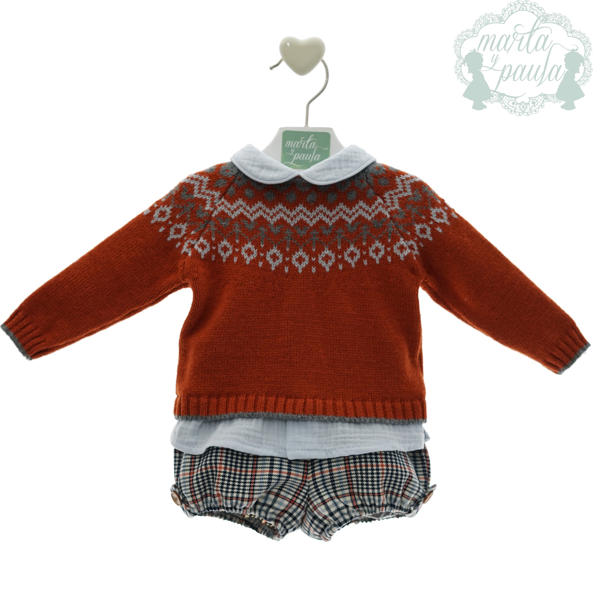 Men's set consisting of a terracotta knit sweater with a jacquard pattern in contrasting tones, a white collared shirt, and a classic plaid diaper cover. A practical and elegant combination, ideal for cold days with a traditional touch full of charm.