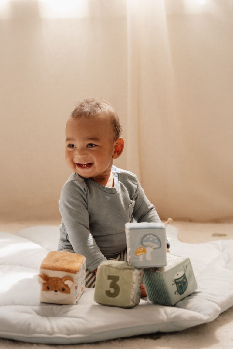 Rattle, shake and roll! With a variety of sounds, textures and features to explore, this fun set of soft activity blocks from the Forest Friends collection will keep your little one entertained. Plus, it encourages hand-eye coordination. The cheerful set consists of four multi-sensory blocks, each defined by soft colors and decorated with a unique number. Baby’s hands will also discover our engaging labels, fuzzy panels and fun mirror.