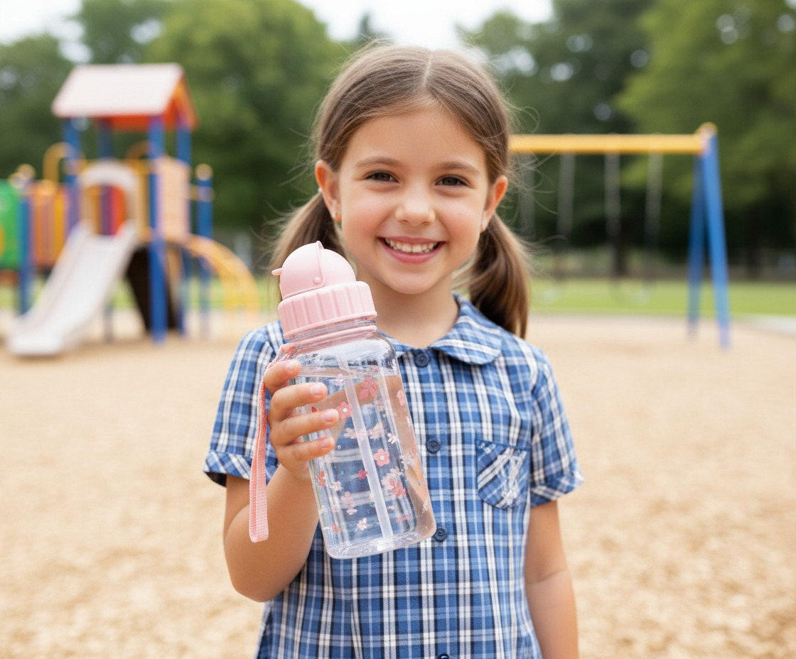 The Leaves Pink plastic bottle is an elegant invitation to drink more water throughout the day. Transparent, with a soft pink lid and delicate pattern of leaves and small flowers , it conveys lightness and joy. Made of durable Tritan plastic , it is lightweight, long-lasting, and BPA-free , ensuring safety with every use. The flip-top lid protects the built-in straw, preventing spills, while the side strap allows the child to comfortably carry it in their hand or hang it on their backpack.