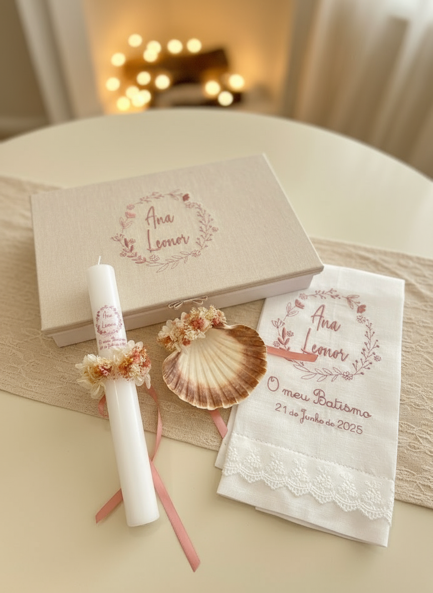 Celebrate this unique moment with a baptism kit designed to cherish memories with care and sophistication. This set includes: