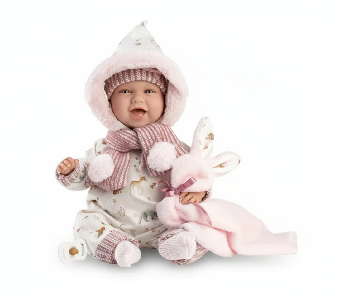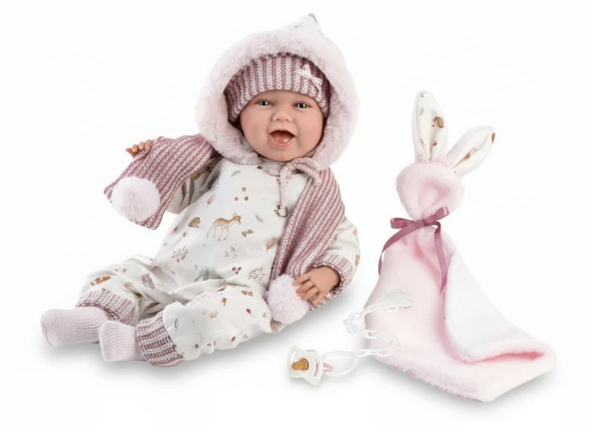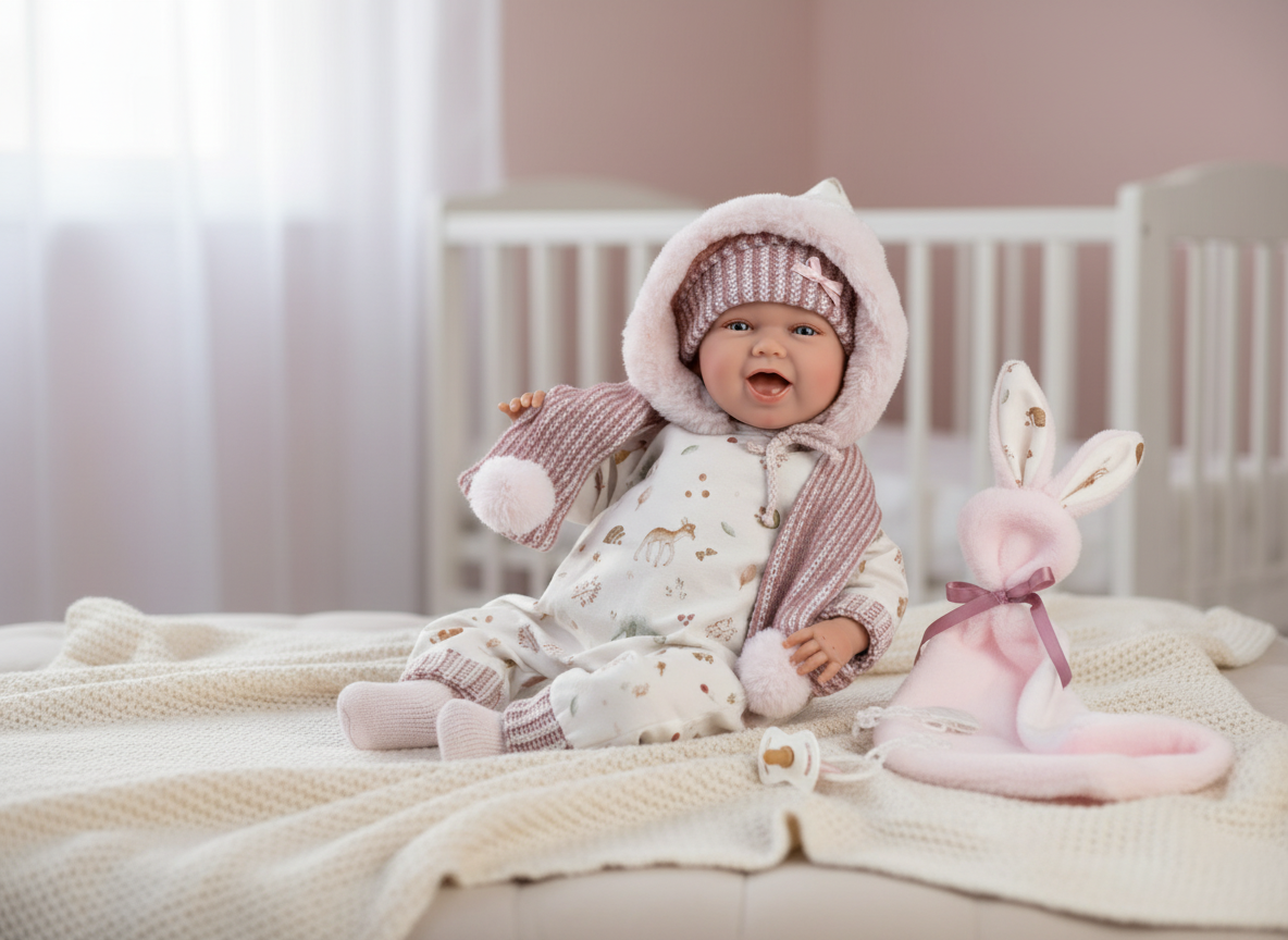 Measuring 42 cm (16.7 in) tall , this Llorens doll enchants with her genuine laughter and sweet voice , saying "mama" and "dada" with the tenderness of a real baby. Her soft, articulated body , with soft-touch vinyl arms and legs , invites moments of affection and imagination. Every detail—from the 100% cotton clothing to the delicate hand-finished in Spain—reflects the care and craftsmanship that define this unique creation.