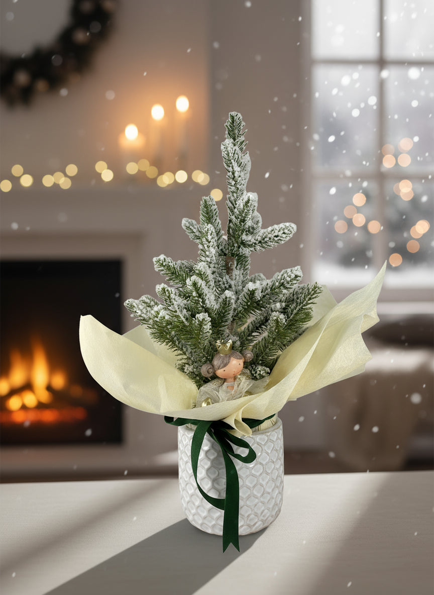 This elegant pine tree and princess vase combines the natural charm of winter with the sweetness of fairy tales. The snowy pine tree , wrapped in delicate ivory paper and a dark green bow, comes to life in a white ceramic vase with a geometric texture , creating a harmonious and sophisticated contrast. Amidst the branches appears a crowned princess , a symbol of tenderness and dreams, completing the ensemble with a poetic and festive touch.