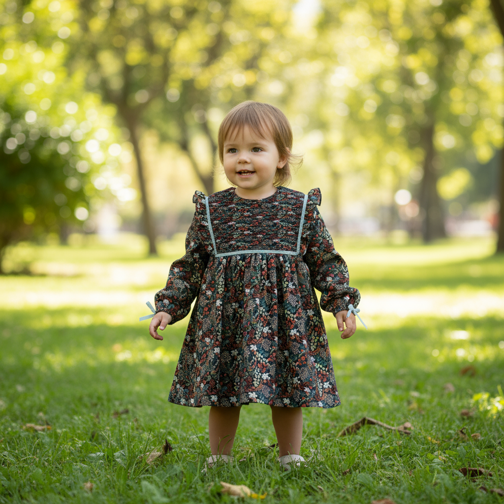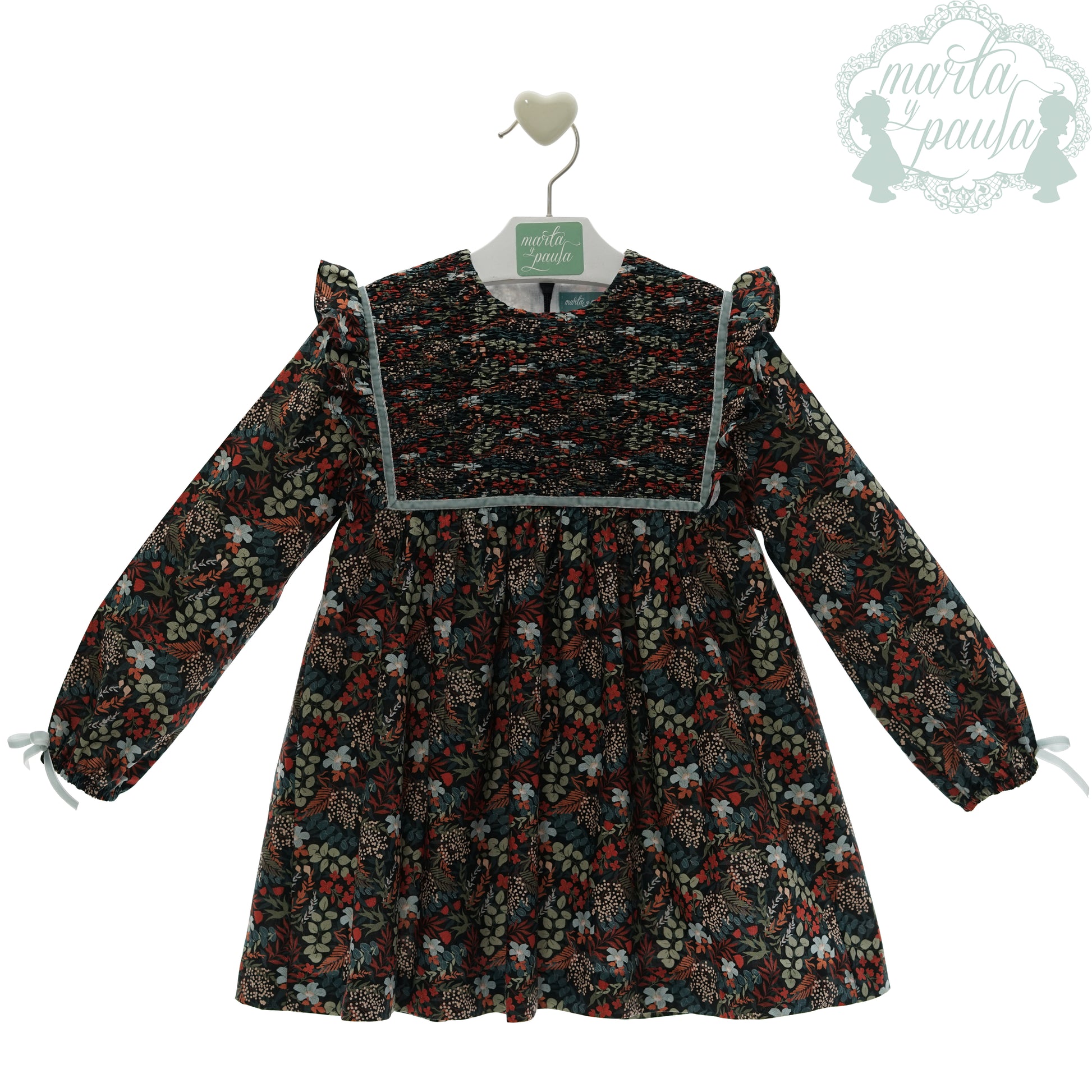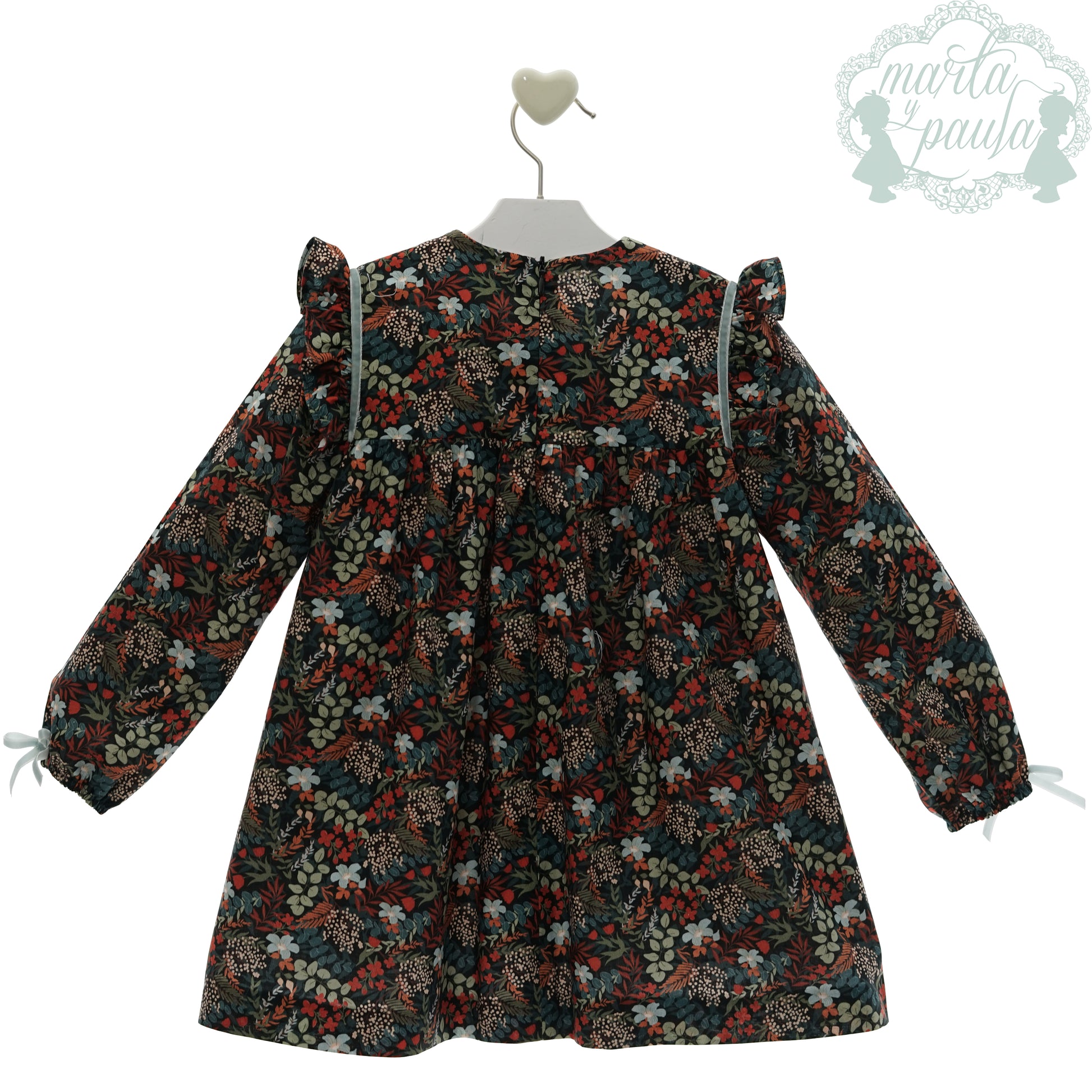 This Marta y Paula dress is a celebration of childlike elegance, combining floral prints in autumnal hues —green, blue, red, and gold—with details that exude tradition. Crafted from a soft, lightweight fabric , it stands out with smock embroidery on the chest and a refined touch of lace , adding sweetness and romance. Long sleeves with subtle bows at the cuffs complete the look with grace and poise.