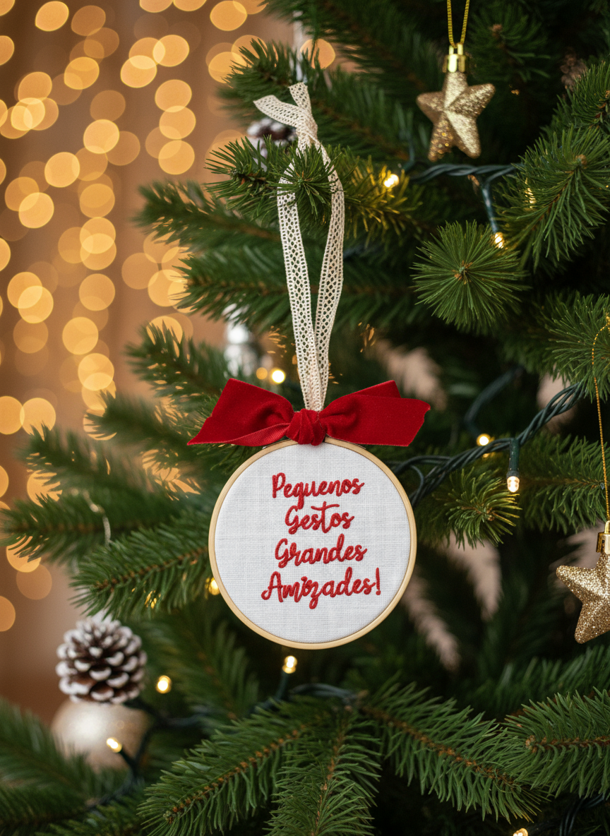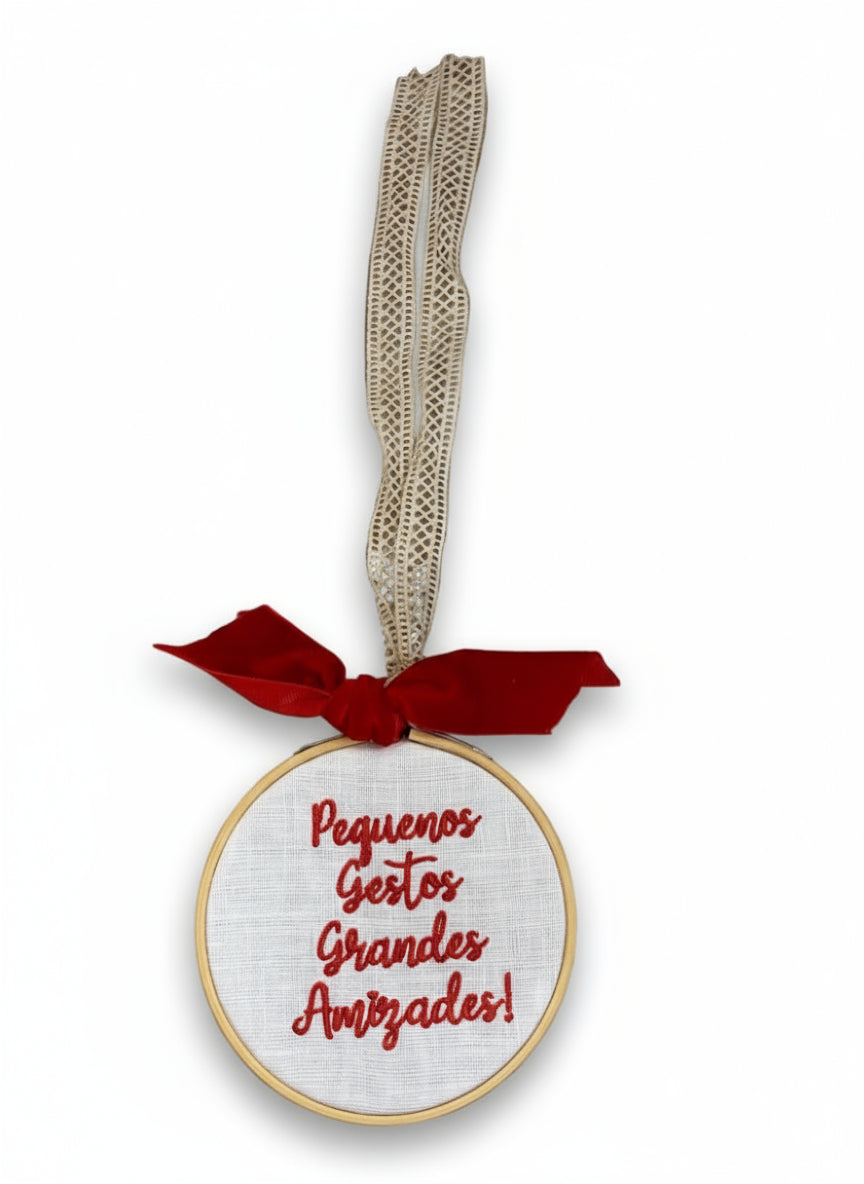 - Bordado artesanal com mensagem “Pequenos gestos, grandes amizades”