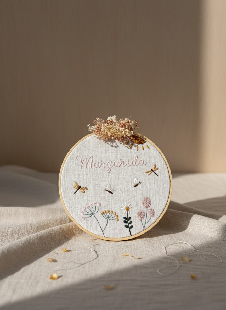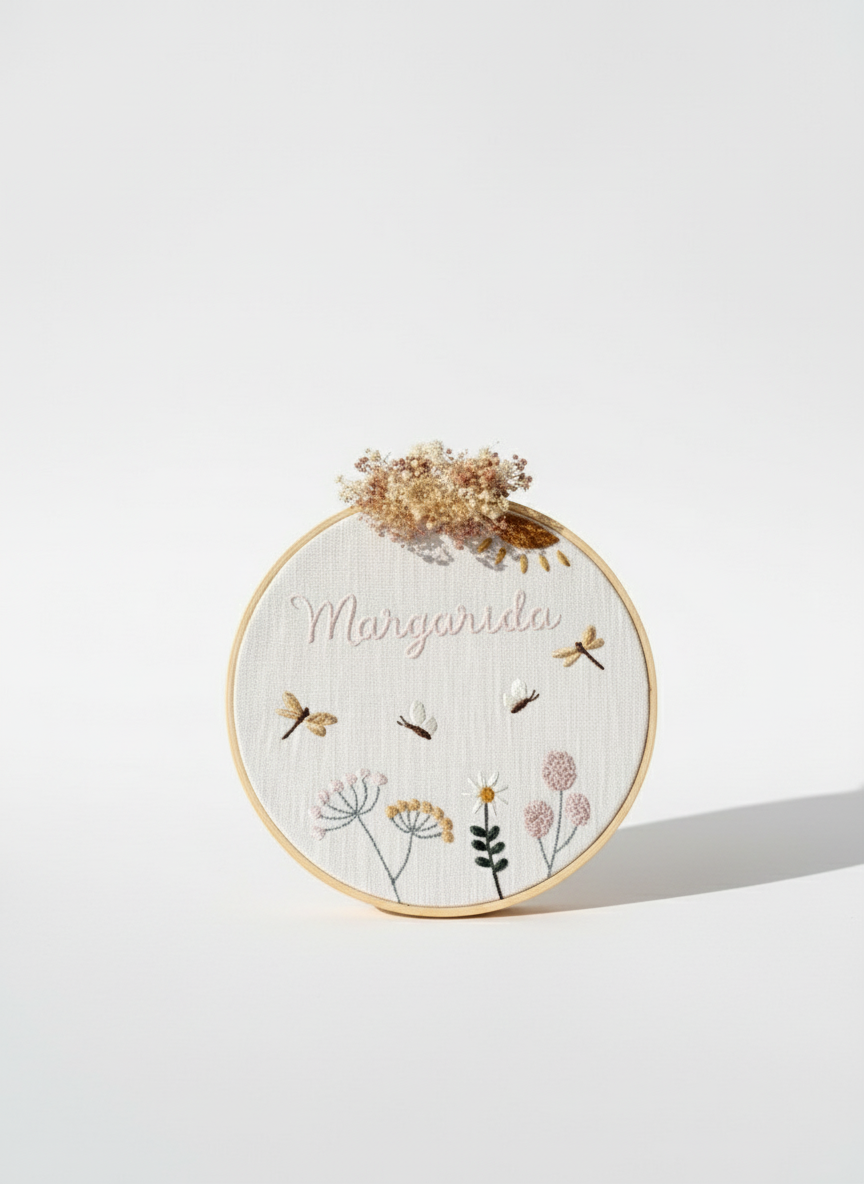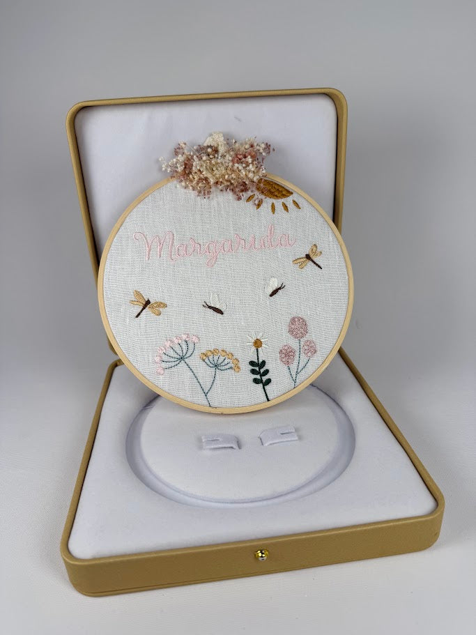 L'image montre un cerceau brodé du nom. La broderie représente une charmante scène de fleurs sauvages , de libellules et d'abeilles qui semblent flotter au-dessus du champ. Au sommet du cerceau, une composition de fleurs stabilisées complète la composition d'une touche naturelle et romantique.