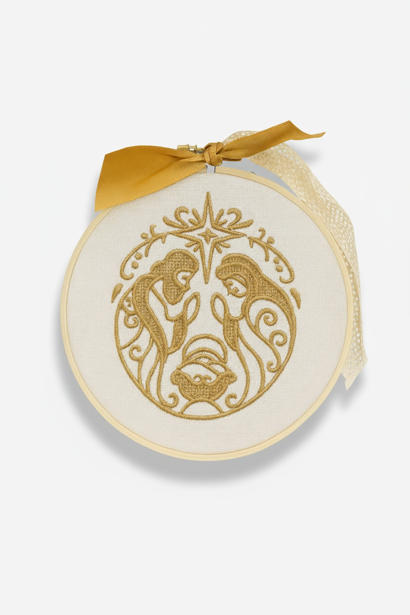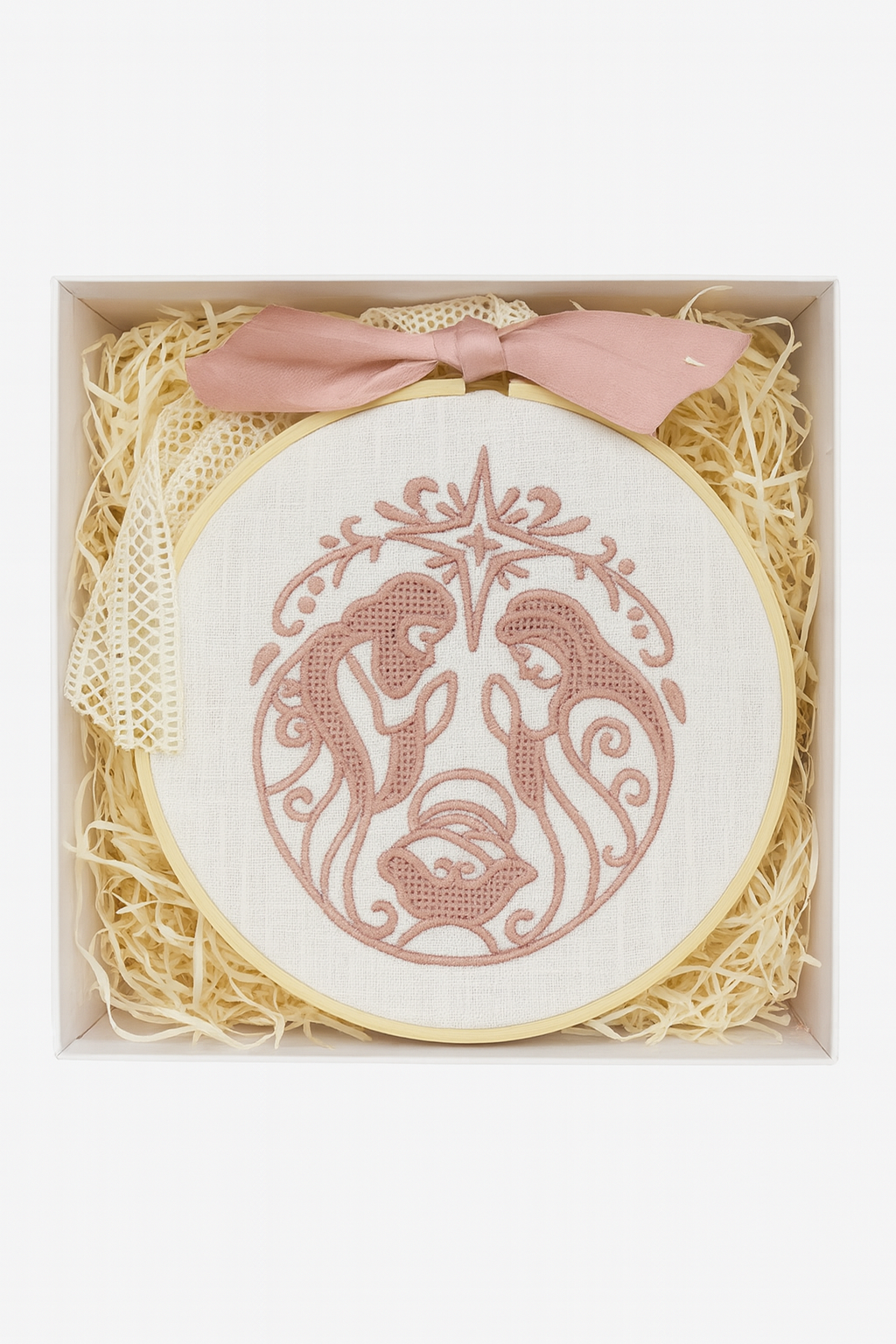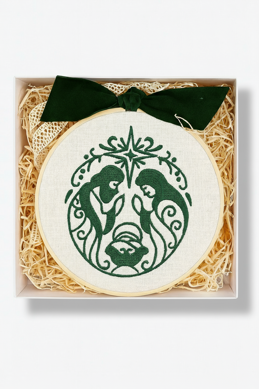 Un cadre brodé au design délicat présente de manière sublime la scène de la Sainte Famille.