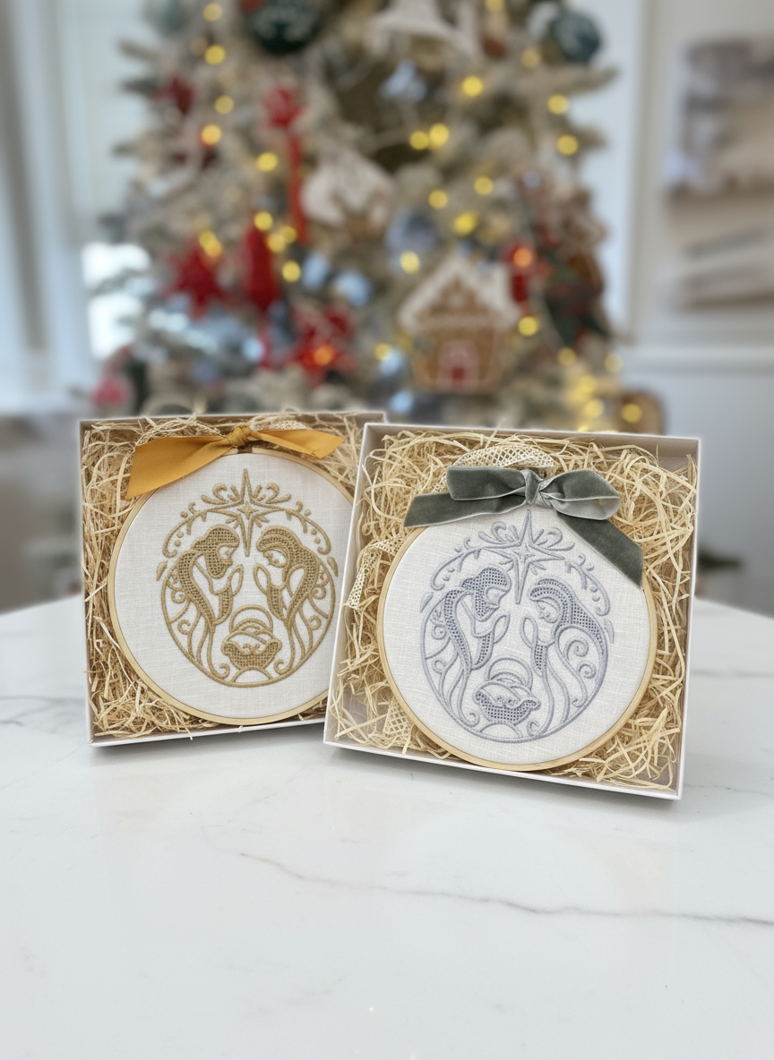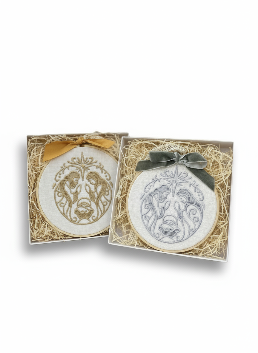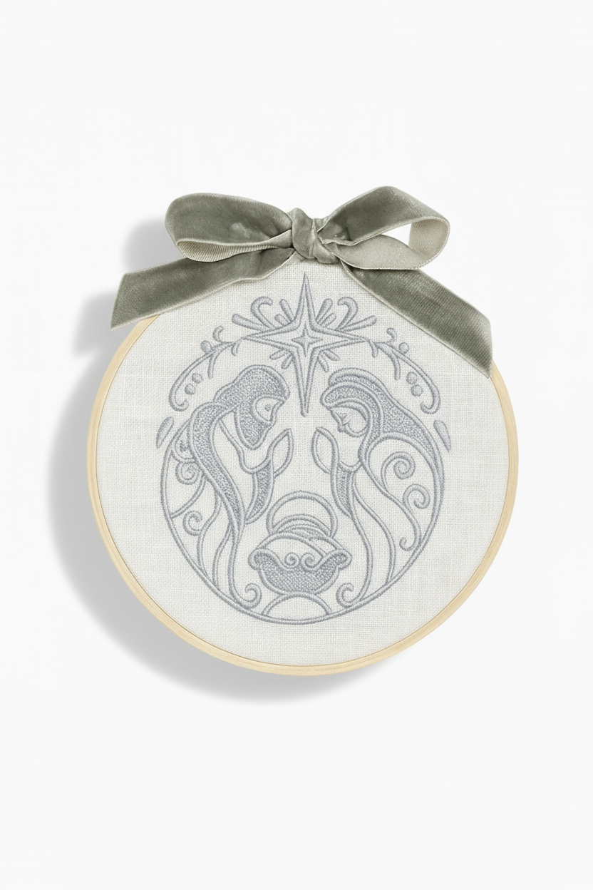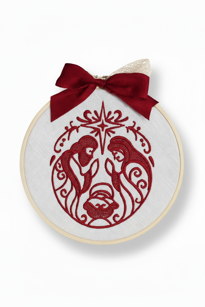 Un cadre brodé au design délicat présente de manière sublime la scène de la Sainte Famille.