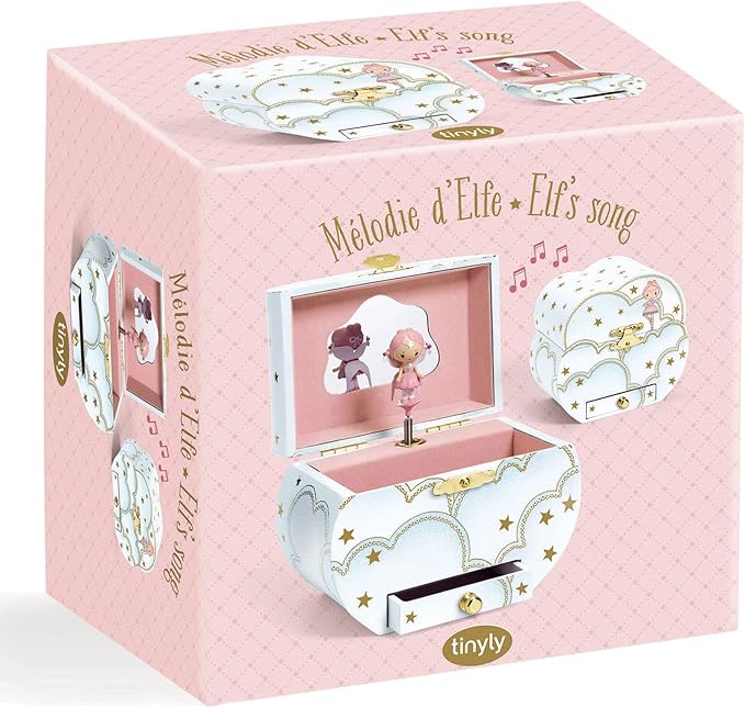 Boîte à musique en forme de nuage avec un tiroir pour ranger bijoux et secrets. Tournez la manivelle, ouvrez la boîte et laissez-vous surprendre : Elf, une fée délicate et parfaitement sculptée, danse et virevolte au rythme de la musique et des étoiles dorées. Musique : « Invitation à la valse » de Carl Maria von Weber, d'une durée d'environ 2 minutes et 30 secondes. Miroir en forme de nuage. Intérieur doublé de velours très doux. Dimensions : 13 x 12,5 x 8 cm.