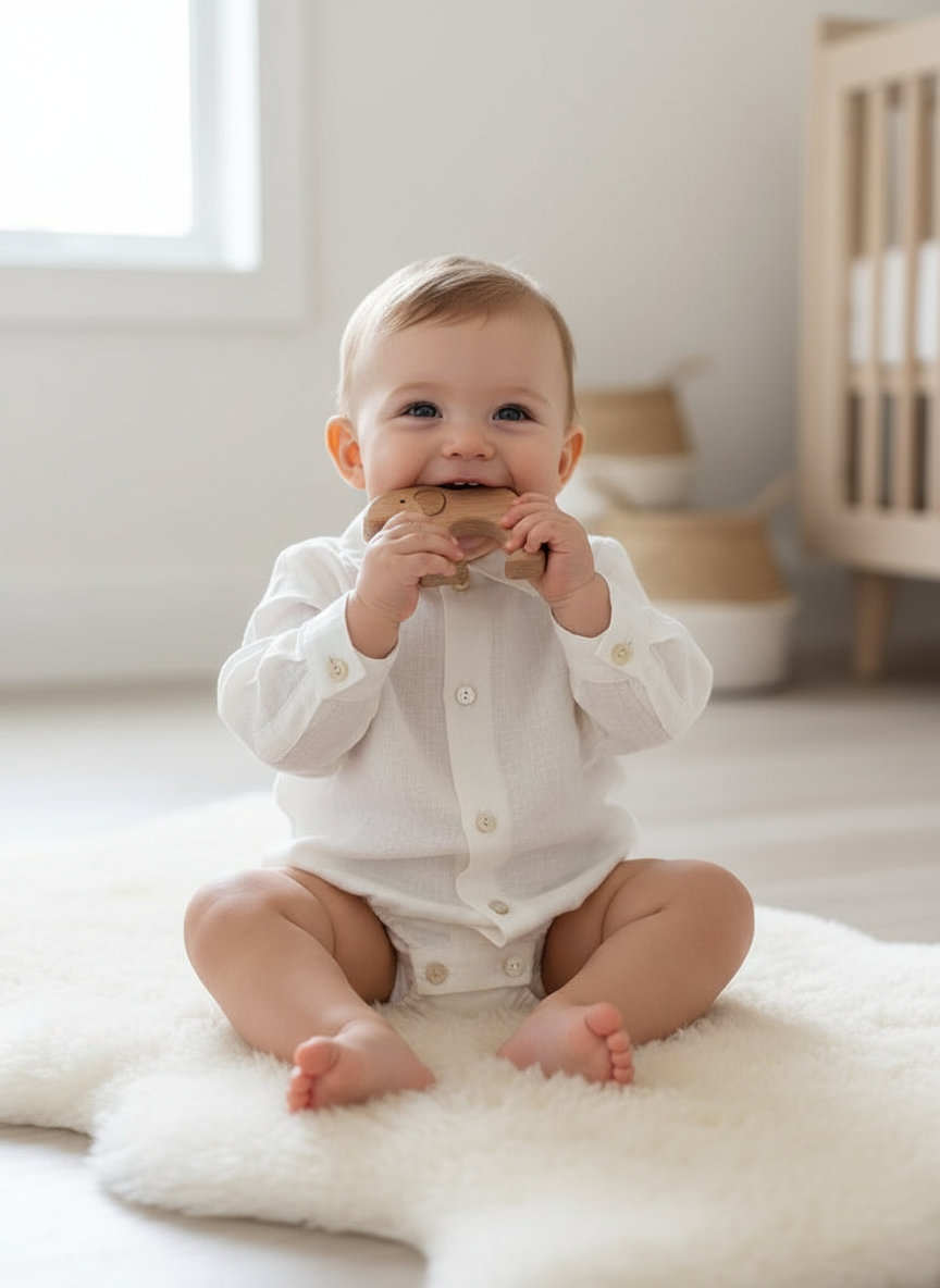 Disponível em manga curta e comprida, nos tamanhos do 3M aos 24M, em linho 100% natural.