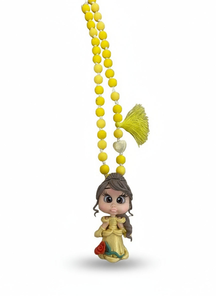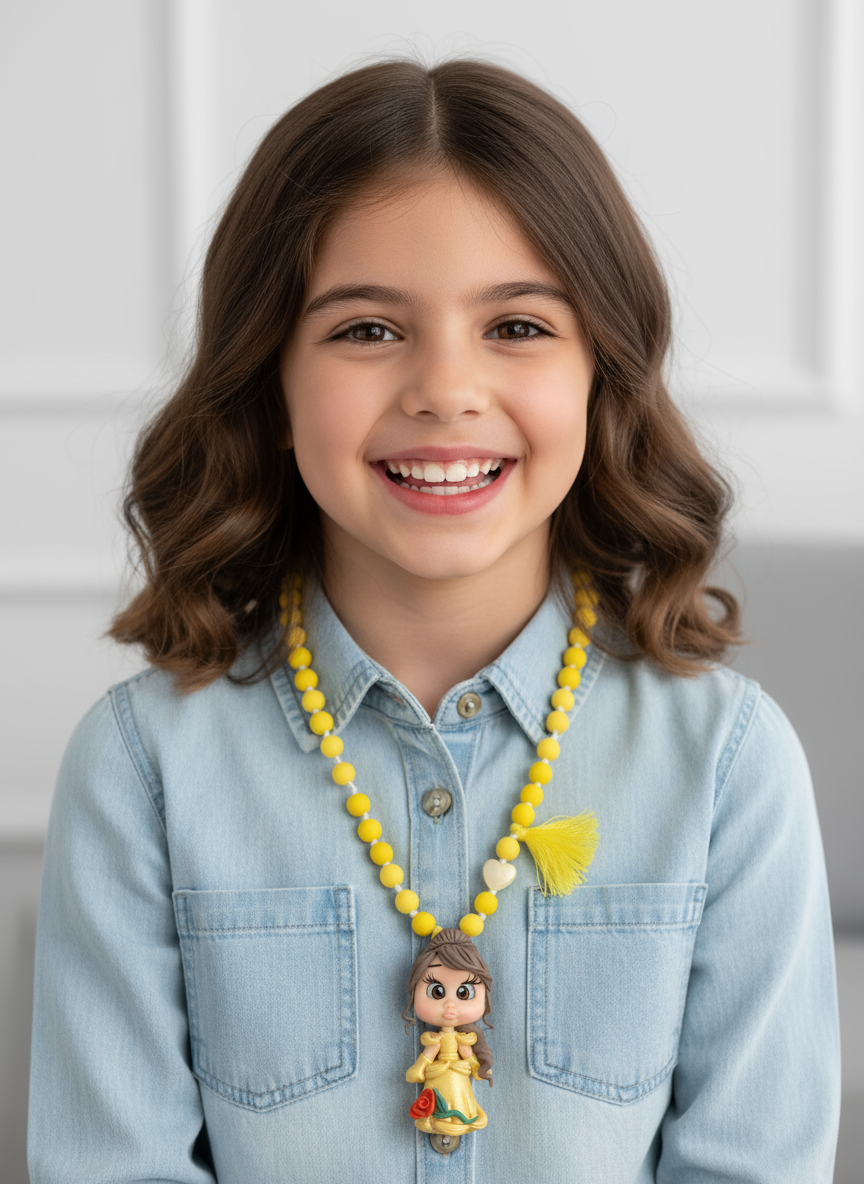 Modelado à mão em biscuit, este colar homenageia a doçura da Bela, com vestido dourado e rosa encantada em miniatura. As contas sortidas combinam brilhos e tons suaves que iluminam o look, mantendo a peça leve e confortável para usar todo o dia. O acabamento é cuidado, resistente e pensado para acompanhar momentos felizes, do brincar às ocasiões especiais.