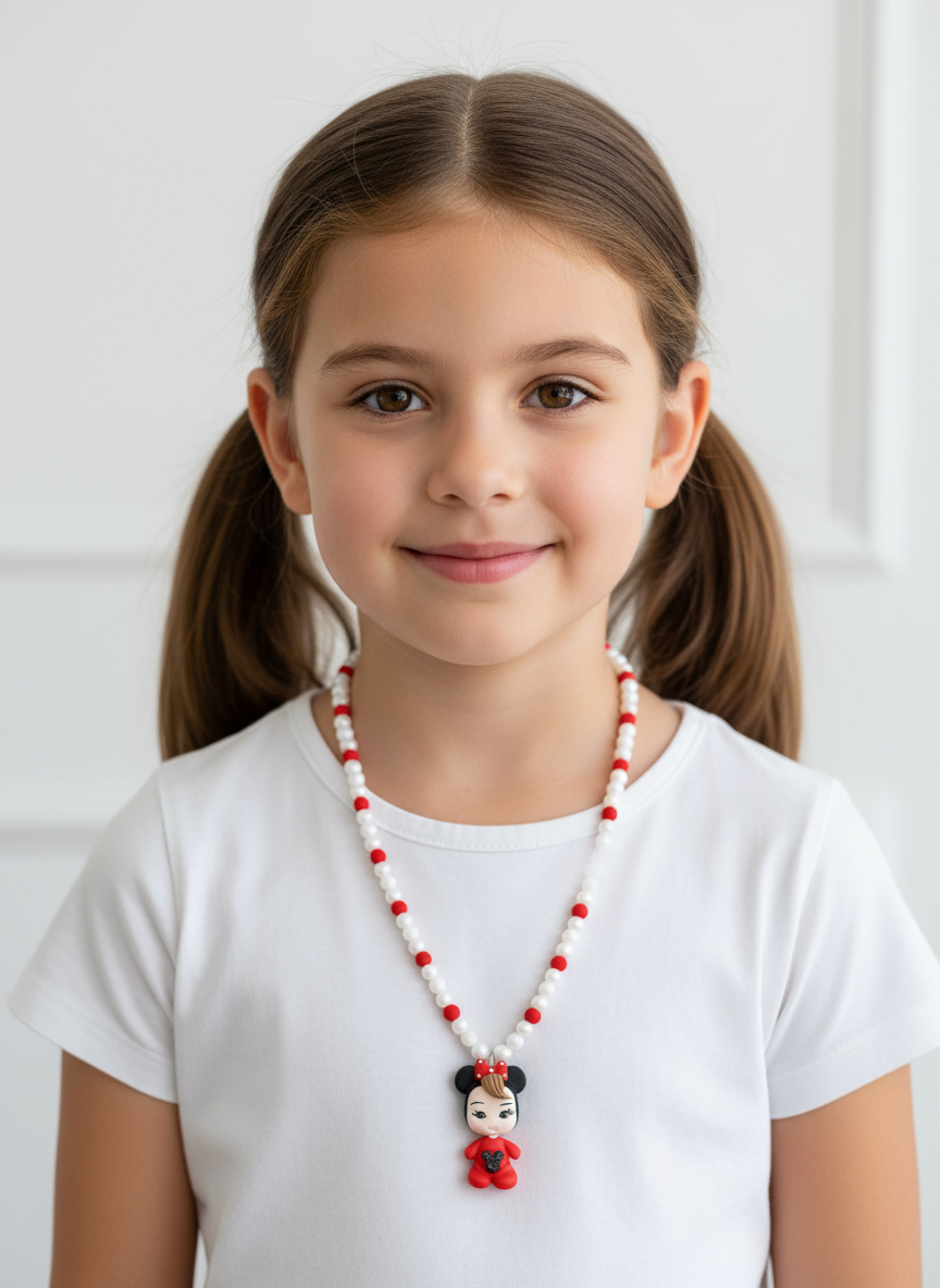 Feito à mão em biscuit, este colar celebra a doçura infantil. As contas acrílicas brancas e vermelhas alternam num desenho leve e resistente. O pendente com laço adiciona encanto e brilho discreto. Cordão elástico macio para vestir com autonomia e conforto.