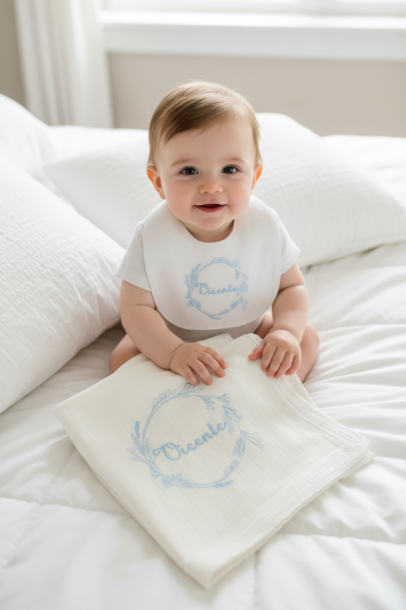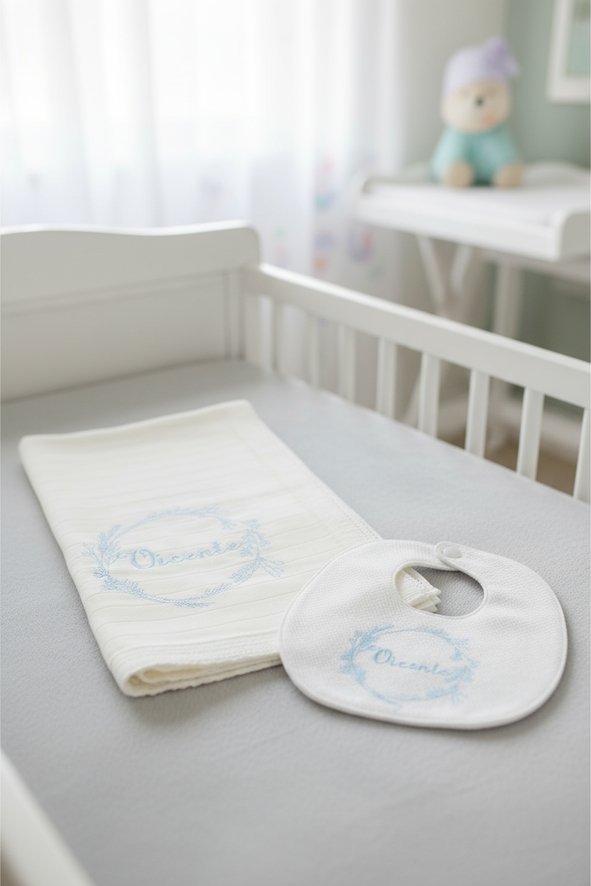 O conjunto de fralda e babete “Vicente” é um símbolo de ternura e cuidado, pensado para os primeiros momentos do bebé. Confeccionado em algodão macio e absorvente, proporciona conforto e suavidade incomparáveis à pele delicada. O bordado azul com o nome “Vicente”, confere um toque personalizado e encantador, transformando cada peça num verdadeiro tesouro artesanal. Um conjunto que une funcionalidade, beleza e emoção — perfeito para oferecer ou guardar como recordação.