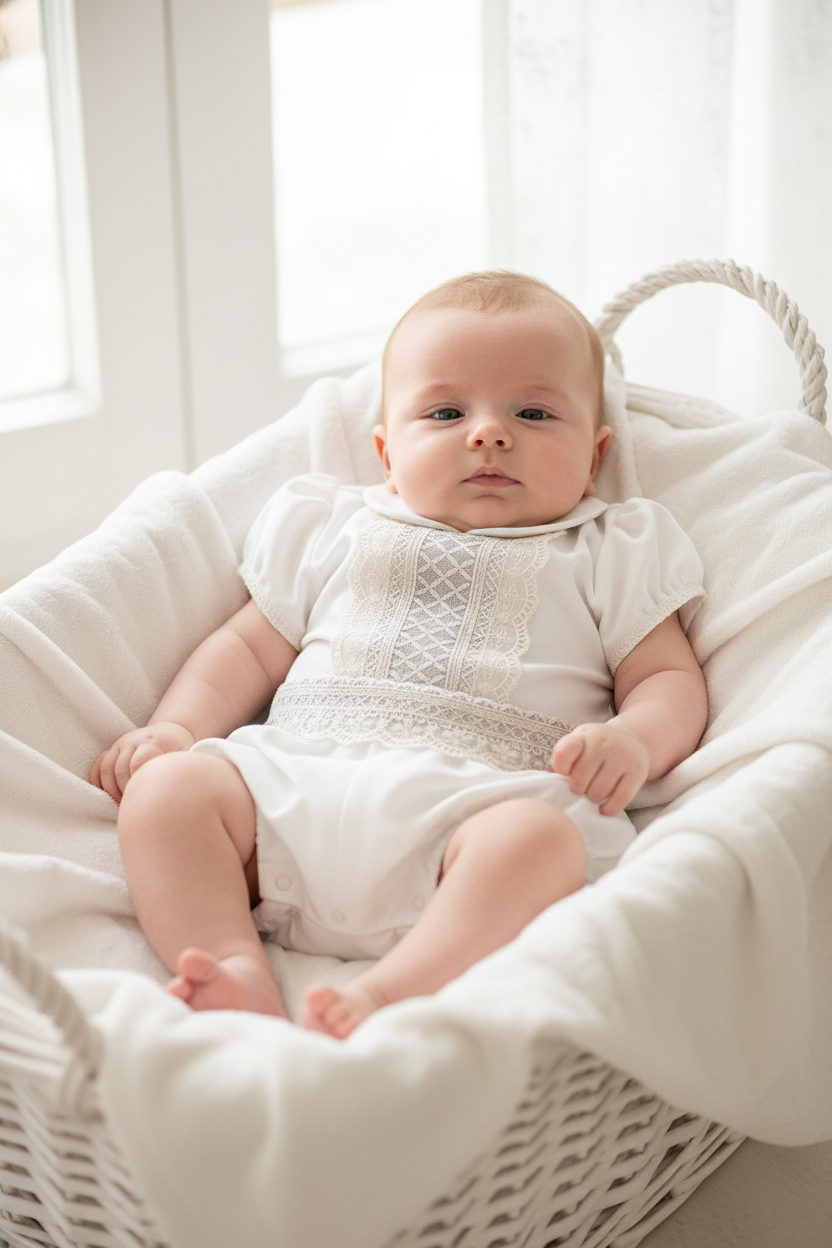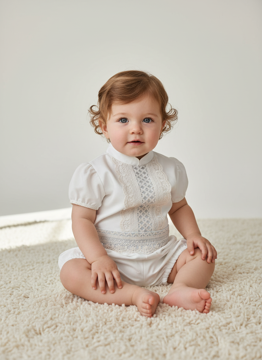 Conjunto de cerimónia para menino em tons bege e verde suave, com trabalho de rendas e aplicação central em entrelaçado que confere elegância intemporal. Confeccionado em algodão macio, respeita a pele do bebé e oferece conforto durante toda a celebração. Camisinha de manga curta com gola delicada e calção tipo balão com cós decorado, criando um efeito harmonioso e muito distinto. Acabamentos primorosos e construção leve para liberdade de movimentos — uma peça pensada para fotografar e guardar no coração.