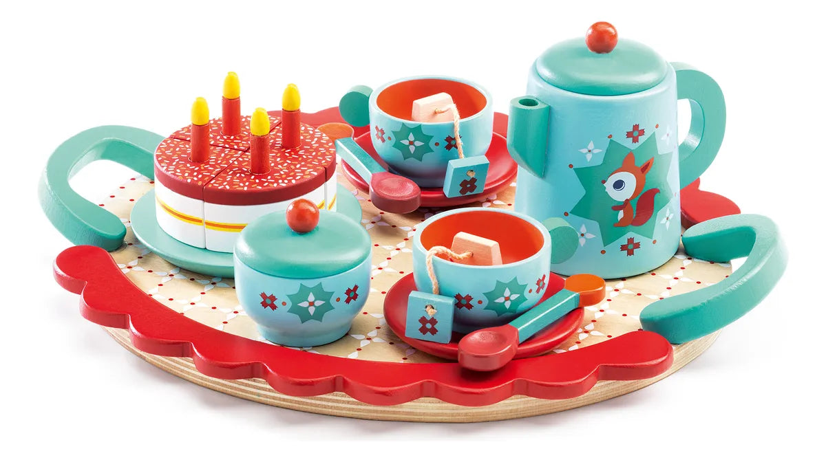 Feito em madeira maciça de alta qualidade, este encantador conjunto de chá da Djeco convida as crianças a recriar momentos cheios de graça e fantasia. A bandeja estampada em vermelho e azul, o bule elegante, o açucareiro e as chávenas delicadas transformam a brincadeira num ritual de charme e partilha. Cada detalhe foi pensado para estimular a criatividade, coordenação e expressão simbólica, num universo de brincadeira refinado e cheio de encanto.