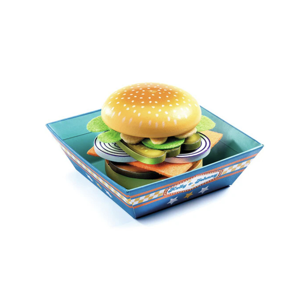 Prepare uma divertida refeição completa com o encantador conjunto “Kelly & Johnny” da marca francesa Djeco. Ideal para a cozinha infantil ou para brincar às vendas no mercado, este kit permite às crianças criar e embalar o seu próprio hambúrguer de brincar — uma atividade deliciosa que estimula a imaginação e o jogo simbólico.