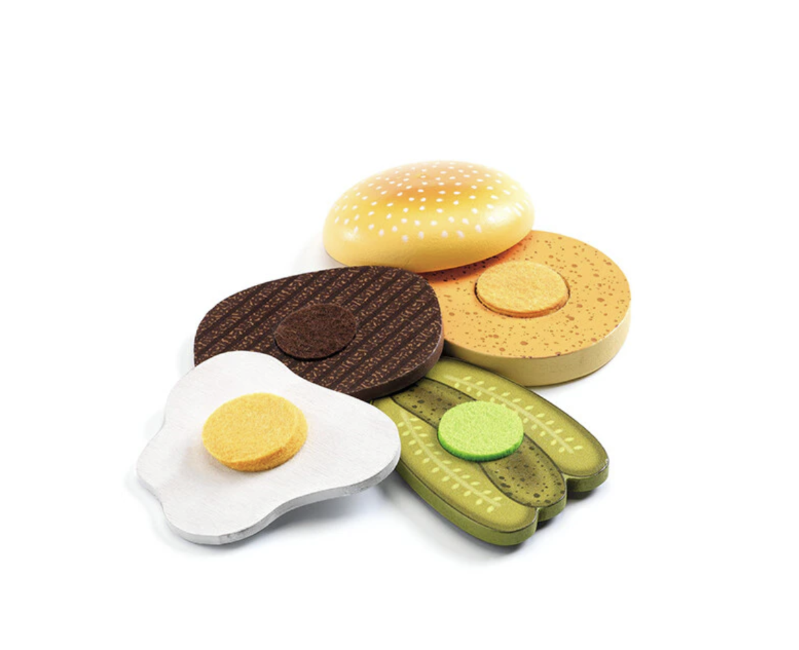 O conjunto inclui peças em madeira certificada FSC e feltro suave, com detalhes realistas e um design cheio de charme. As crianças podem seguir os cartões de exemplo ou inventar as suas próprias receitas para preparar os hambúrgueres mais saborosos.
