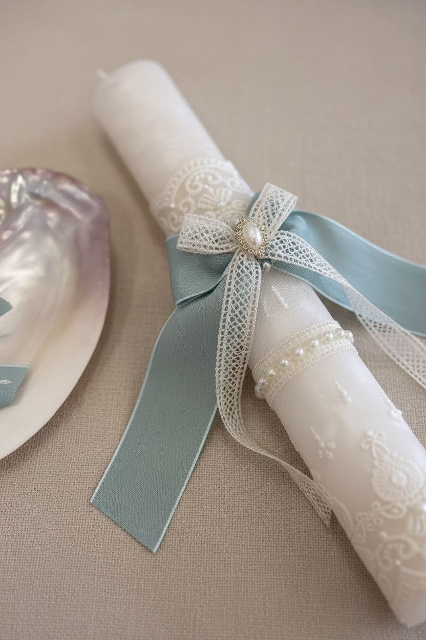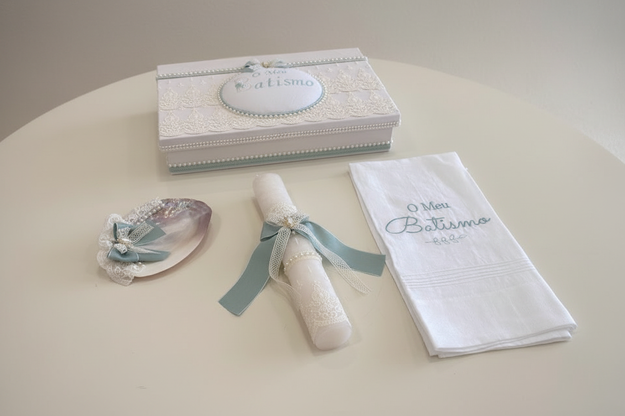Inclui caixa decorativa, vela ornamentada, concha e toalha bordada. Conjunto apresentado em tons de branco e verde, com detalhes rendados e laços em fita, num equilíbrio perfeito entre tradição e sofisticação.