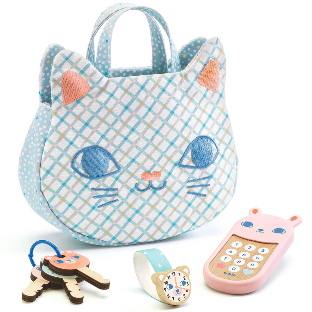 A Mala de Brincar Gato da Djeco é um convite irresistível ao jogo simbólico e à imaginação. Com o formato encantador de uma cabeça de gato bordada, esta mala combina materiais naturais como madeira e têxtil, oferecendo um toque suave e robusto. No interior, escondem-se acessórios que despertam a fantasia: um relógio com bracelete elástica, um telemóvel com capa e um molho de 3 chaves, ideais para brincar aos adultos com criatividade e doçura.