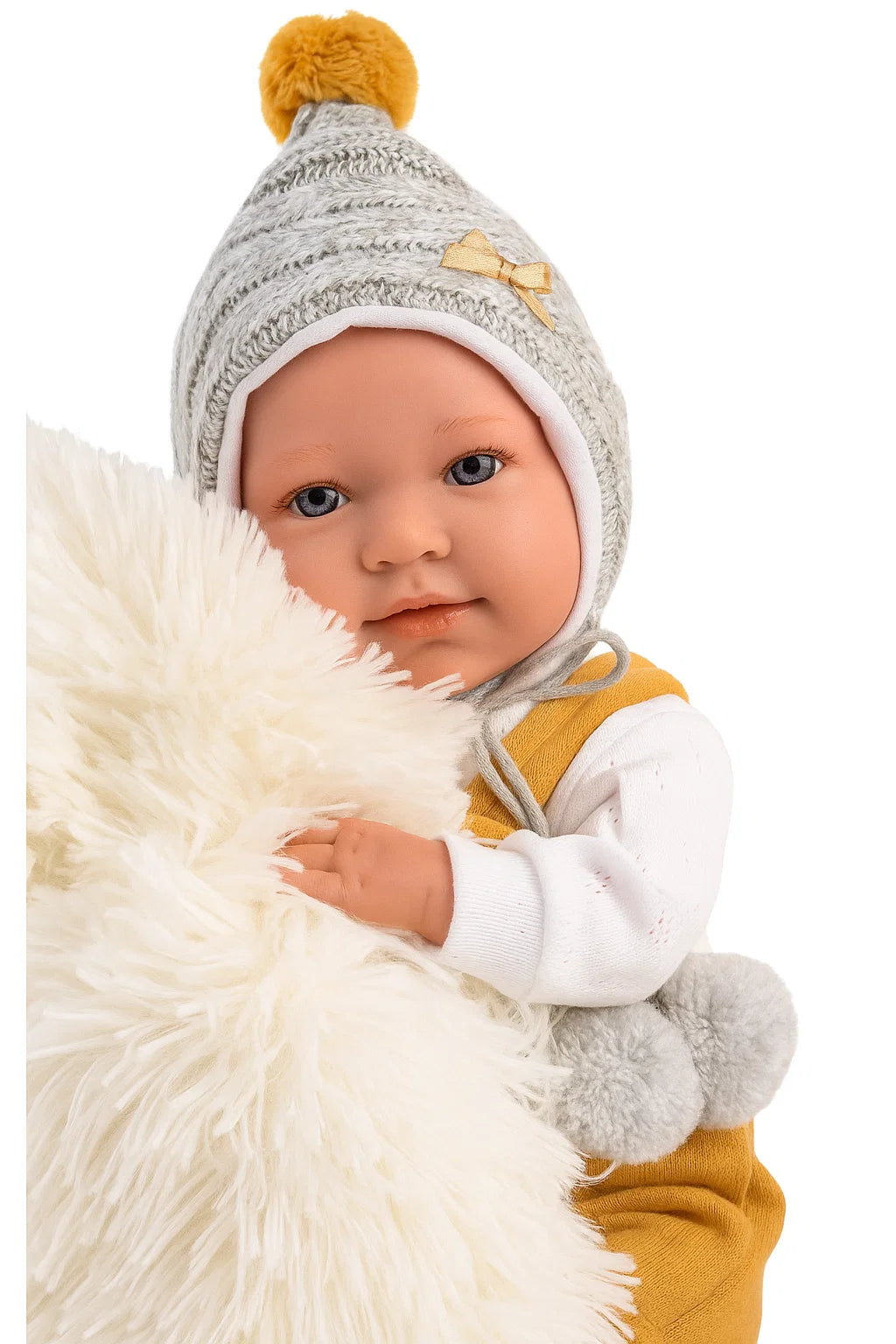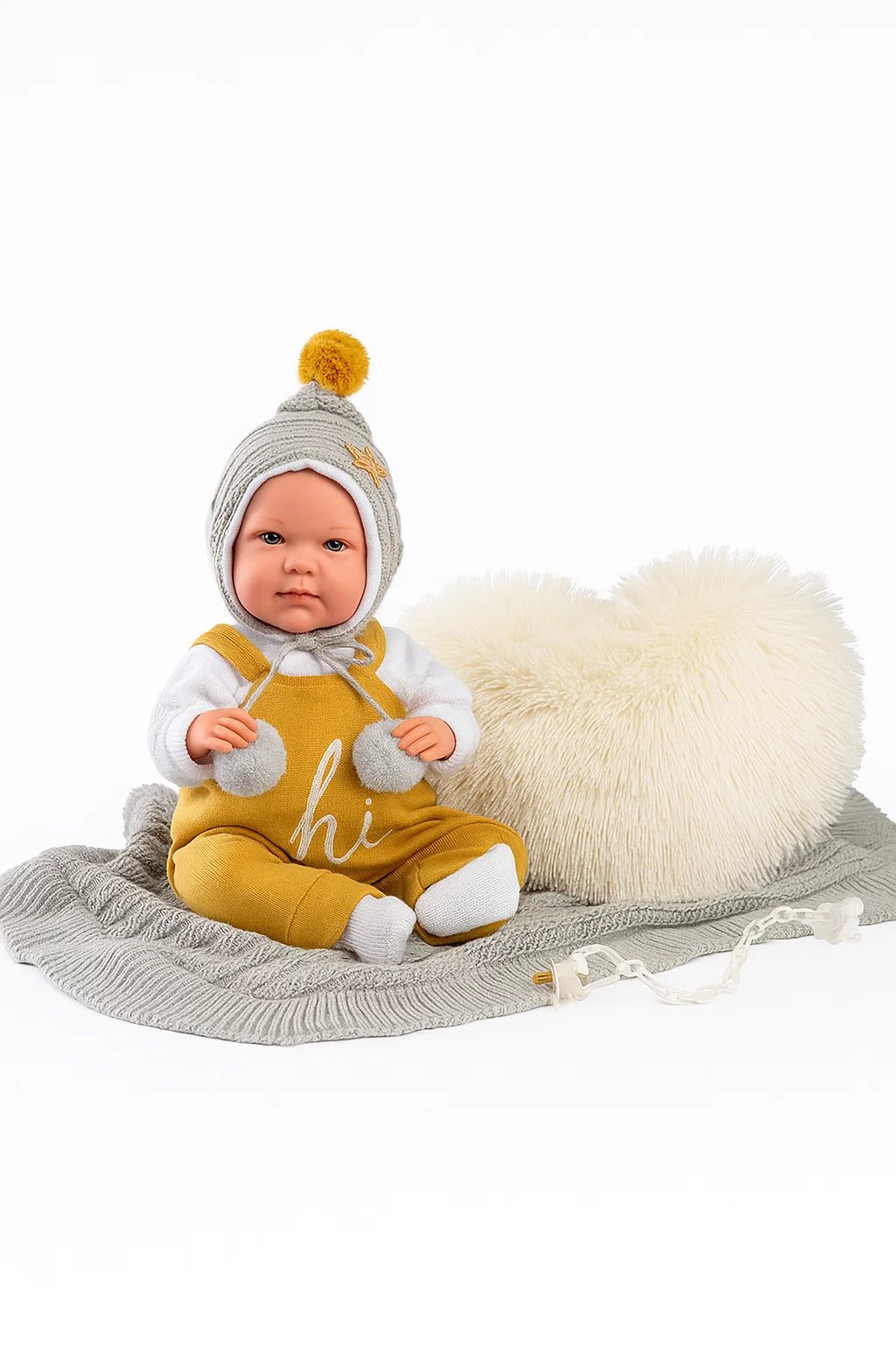 La poupée Nica « Hi » est une création artisanale de Llorens, fabriquée en Espagne avec la délicatesse qui caractérise le charme enfantin. Mesurant 42 cm , elle possède un corps en tissu doux et des bras et jambes articulés en vinyle , reproduisant le toucher et les gestes d'un vrai bébé. Elle porte une adorable tenue 100 % coton aux tons moutarde et gris, avec un bonnet en tricot et des pompons. Lorsqu'elle pleure, elle appelle papa et maman , rendant les moments de jeu encore plus authentiques.