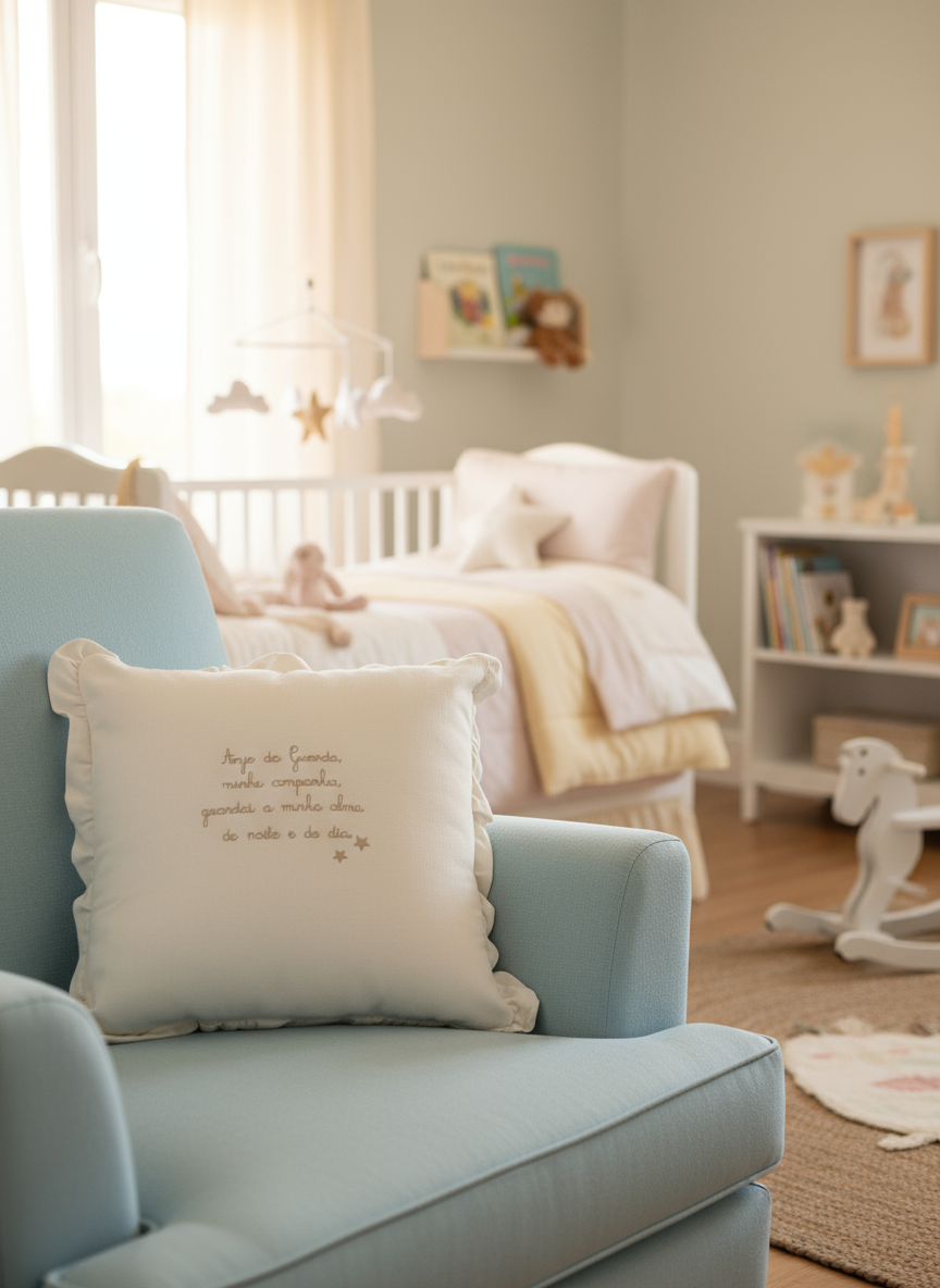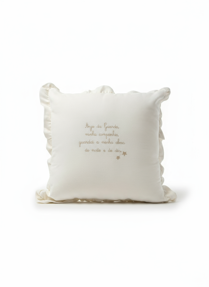 Feita com tecido suave e de alta qualidade, esta almofada é um símbolo de paz, conforto e proteção. O delicado bordado da oração do Anjo da Guarda confere-lhe um toque espiritual e poético, tornando-a uma peça especial para momentos de recolhimento ou descanso. O seu design clássico, com folho em toda a volta, reflete a elegância intemporal que caracteriza o universo Atelier Hábitos de Geração.