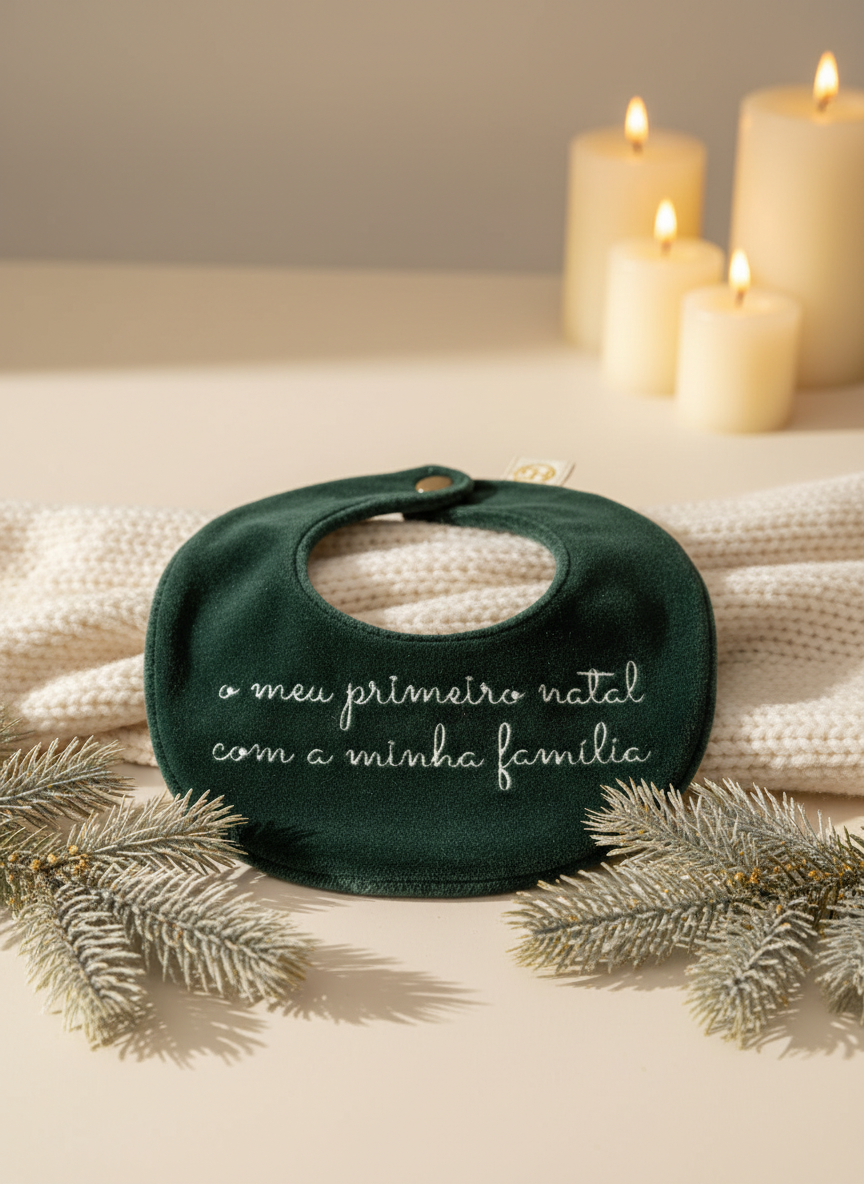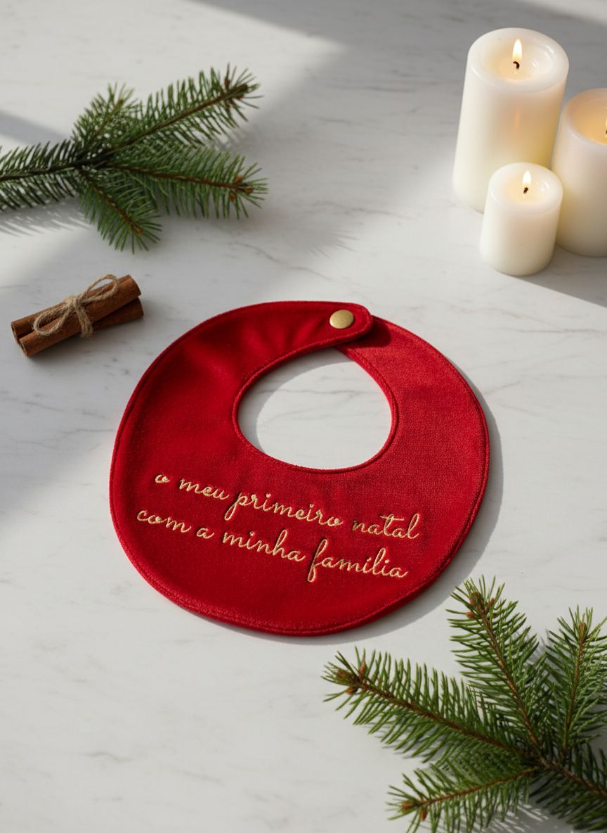 O babete de Natal em veludo é uma peça irresistível que une suavidade, elegância e espírito festivo. Confeccionado em veludo macio e delicado, oferece um toque aconchegante e confortável, perfeito para proteger a roupinha do bebé durante as celebrações. O bordado dourado com mensagem natalícia acrescenta um toque de encanto e exclusividade, tornando este acessório um verdadeiro símbolo de carinho. Uma criação especial do Atelier Hábitos de Geração, pensada para celebrar o primeiro Natal com amor e estilo.