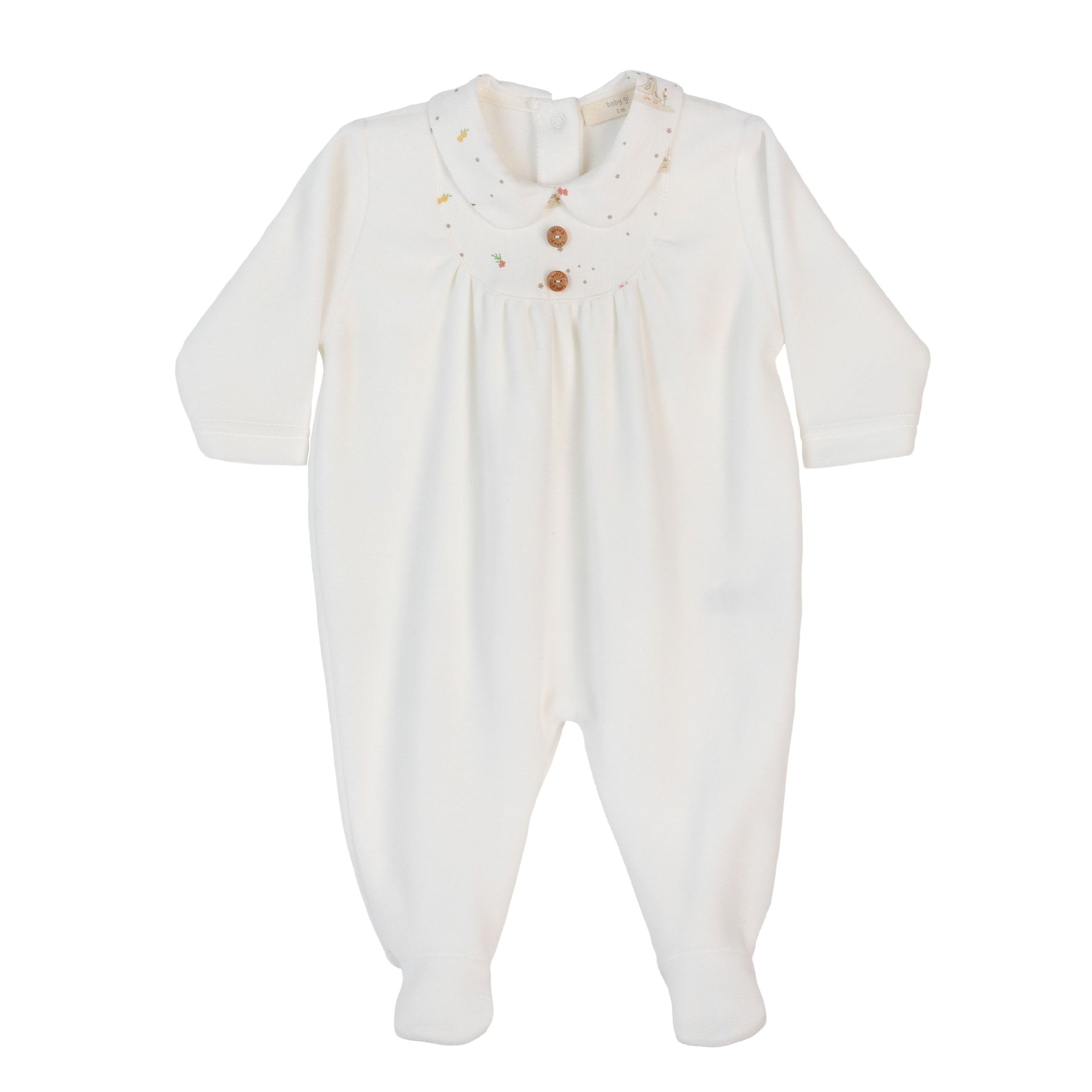 Macacão em algodão macio com gola bordada delicada e botões em madeira. Confortável, prático e elegante para o dia a dia ou ocasiões especiais.