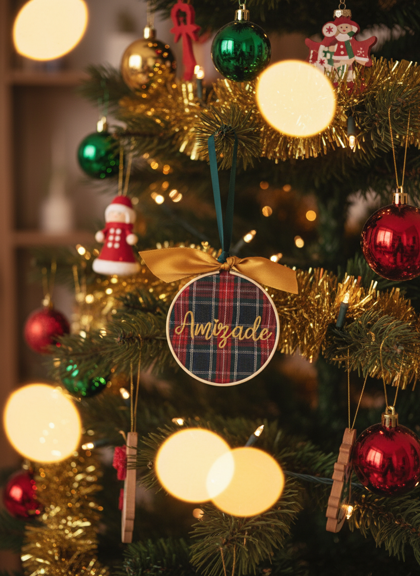 Este bastidor d10 em tecido tartan é um tributo delicado às amizades que aquecem o coração. Sobre o xadrez clássico, em tons profundos de vermelho, verde e azul, a palavra “Amizade” surge em dourado suave, com um pequeno coração a sublinhar todo o carinho que representa. O aro em madeira natural realça o lado artesanal da peça, enquanto o laço no topo acrescenta um toque festivo e elegante, perfeito para quem gosta de detalhes cheios de significado.