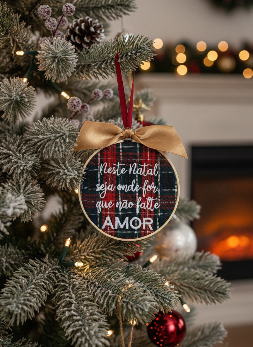 Este bastidor d10 em tecido tartan vermelho e verde traz a magia clássica do Natal para dentro de casa. Sobre o xadrez tradicional, a mensagem “Um Natal com Saúde e Amor” é bordada em fio branco, criando um contraste doce e luminoso. O aro em madeira clara e o laço no topo reforçam o carácter artesanal e acolhedor, transformando esta peça num detalhe especial para pendurar na árvore, na porta ou num cantinho cheio de memórias.