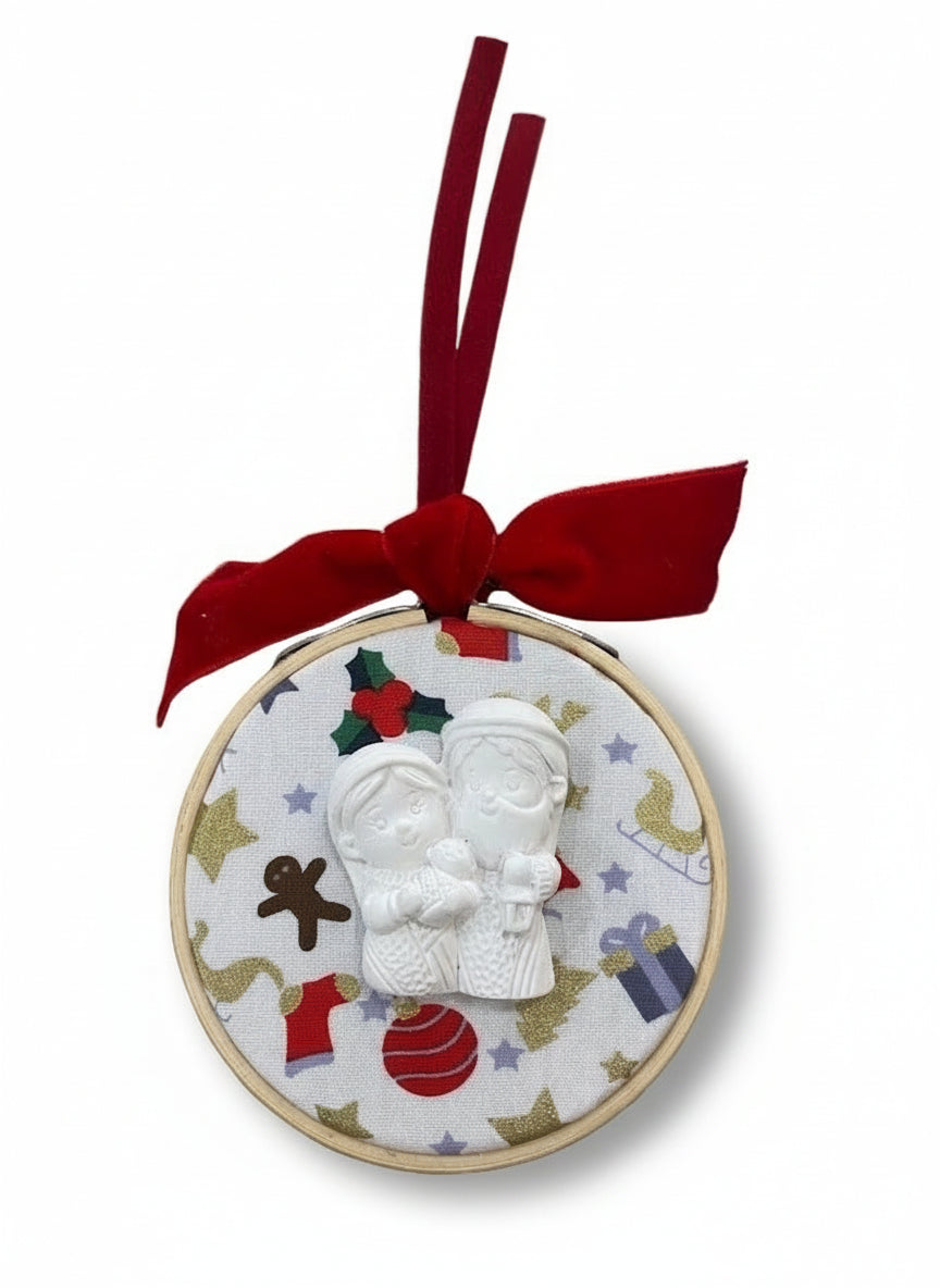 Este bastidor d8 com aplicação em gesso da Sagrada Família é um detalhe delicado que ilumina qualquer canto da casa. O fundo em tecido natalício com estrelas douradas, presentes e guirlandas contrasta com a simplicidade do relevo branco, criando um efeito doce e harmonioso. O laço de veludo vermelho remata a peça com um toque clássico, perfeito para quem gosta de celebrar o Natal com elegância, significado e memórias que passam de geração em geração.