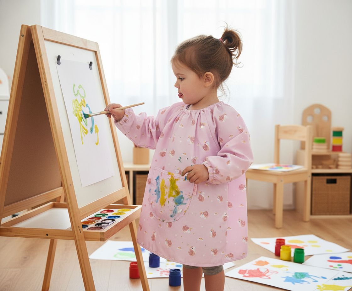A bata Magical Unicorn envolve a criança com leveza e proteção, em rosa suave pontuado por unicórnios e arco-íris. Confeccionada em tecido impermeável e resistente, resguarda a roupa nas refeições e nas atividades criativas. A gola com elástico veste num gesto; as mangas compridas com punhos elásticos acompanham cada movimento. O bolso central amplo guarda guardanapos, pincéis ou pequenos tesouros. Limpeza prática: pano húmido ou máquina a 30º, secagem ao ar.