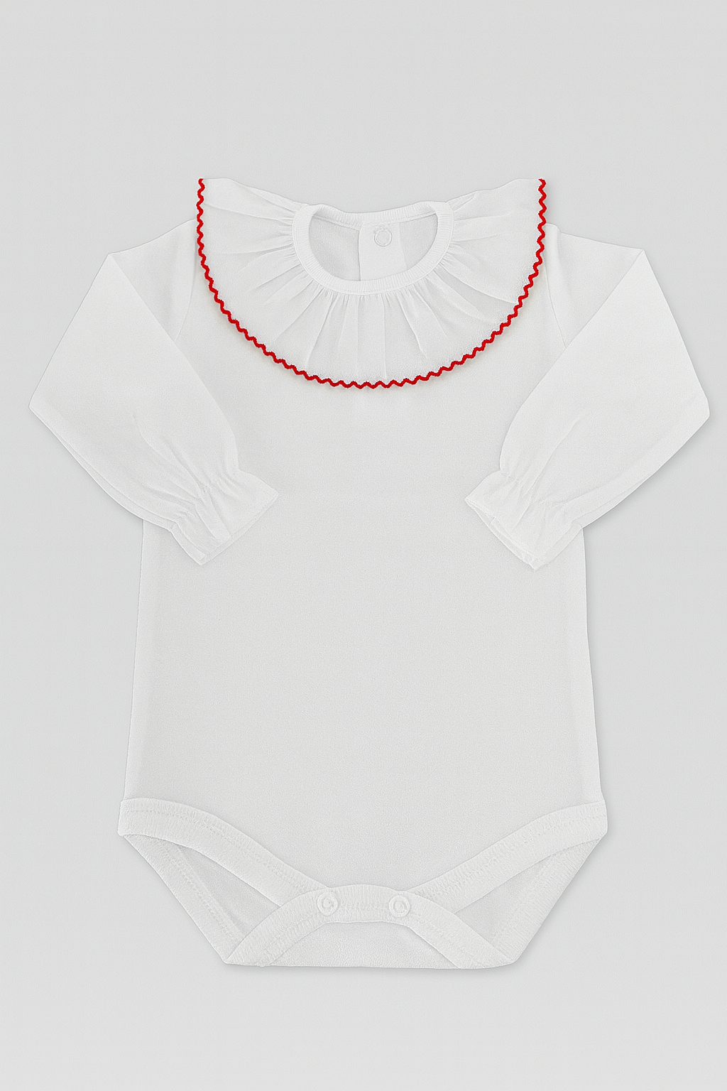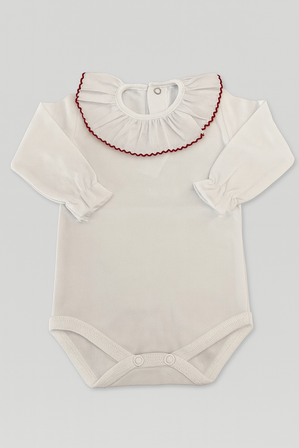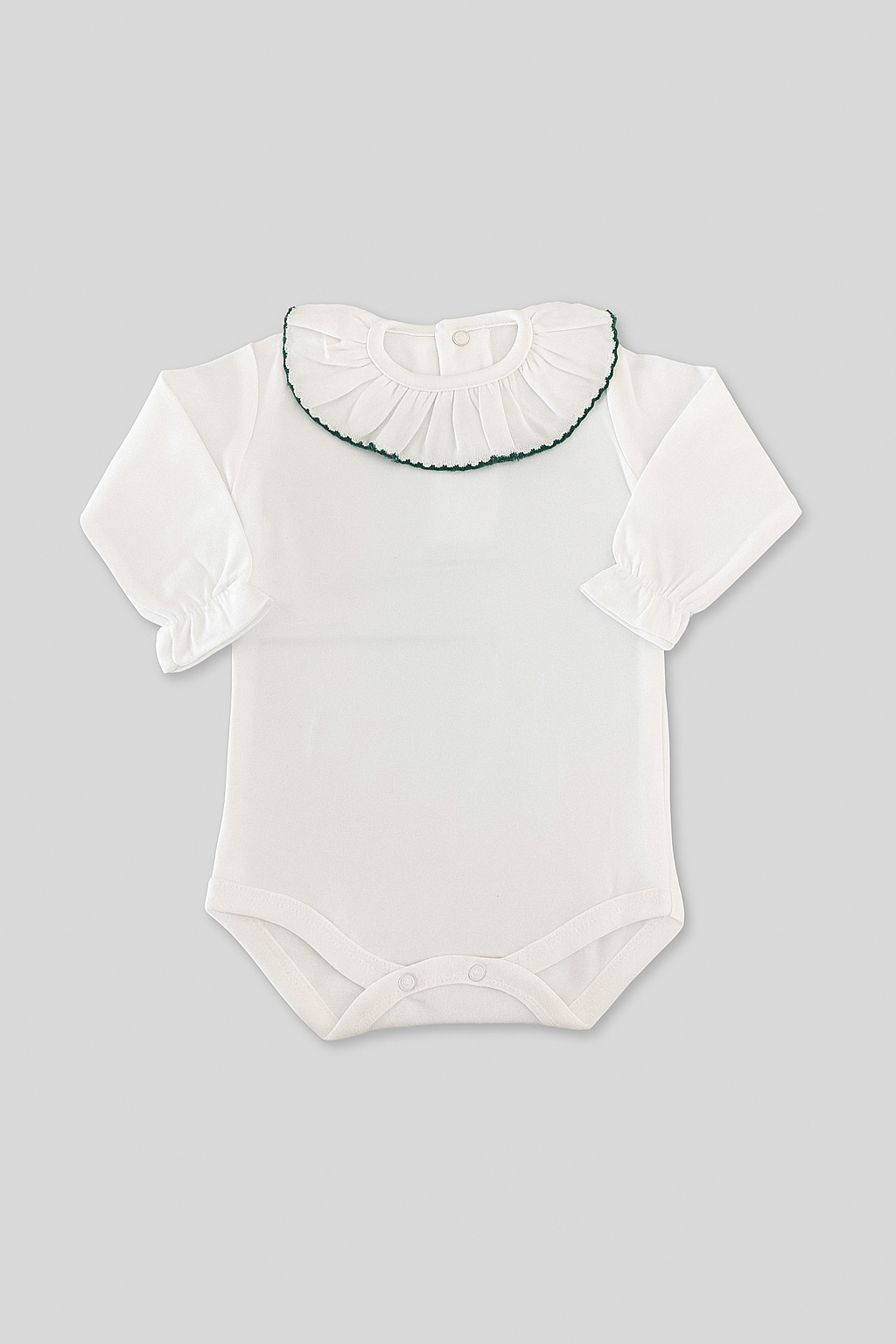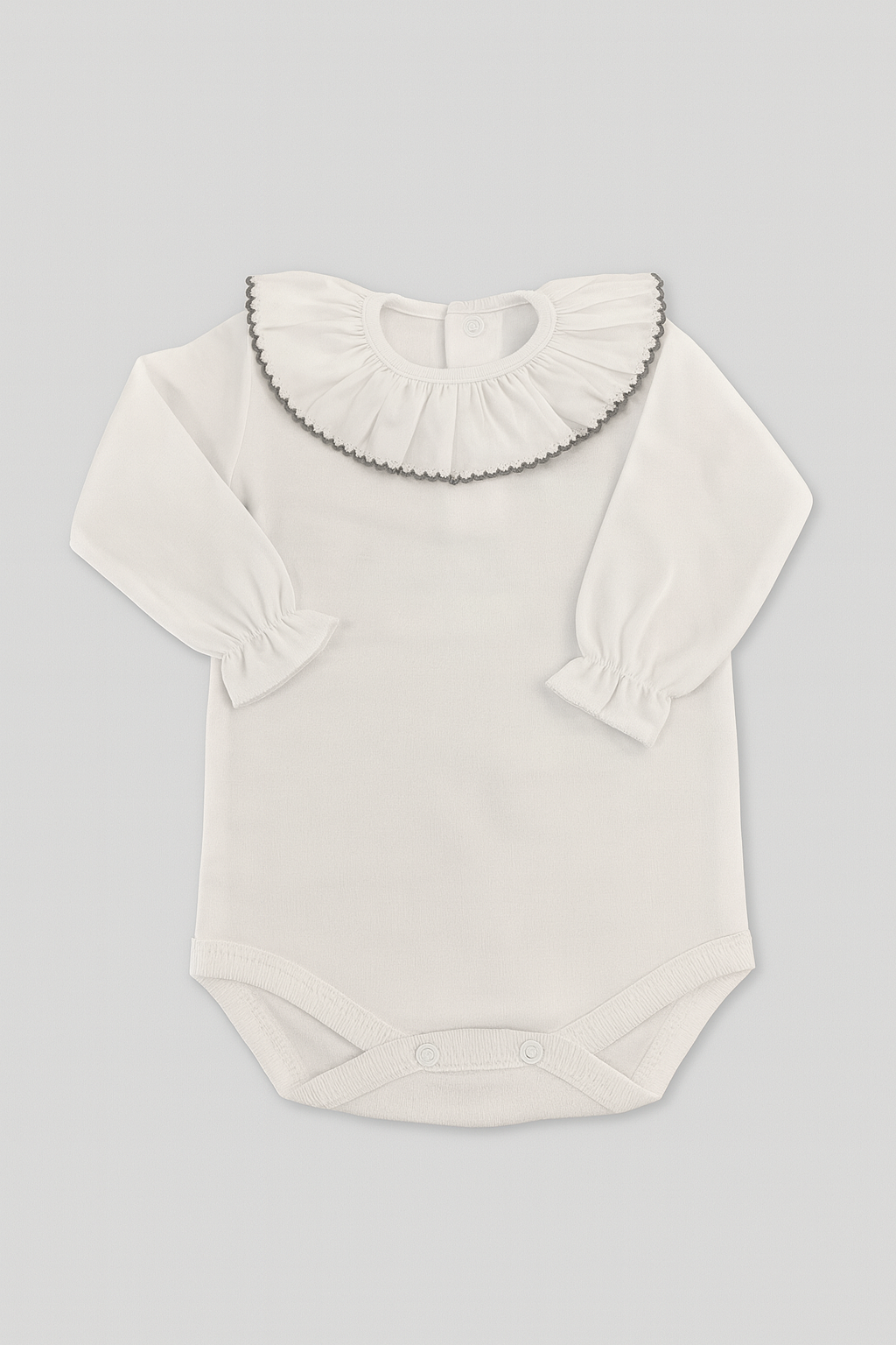 Confeccionado em algodão suave e respirável, este body de manga comprida oferece um toque delicado à pele sensível do bebé, garantindo bem-estar ao longo de todo o dia. O design distinto com gola em folho e acabamento em cores contrastantes adiciona um toque de charme e sofisticação, perfeito para coordenados clássicos e elegantes. O fecho de molas discreto na parte inferior facilita a troca, mantendo o conforto e a praticidade que cada mãe procura.