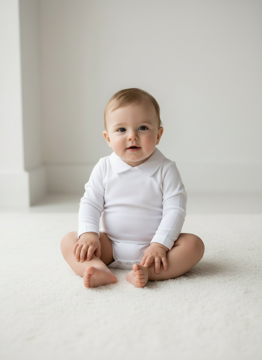 Este body branco de manga comprida é confeccionado em malha macia e respirável, ideal para pele sensível do bebé. A gola em bico dá-lhe um toque clássico e arrumado, perfeito para usar à vista sob fofos, jardineiras ou camisolas. O tecido estica suavemente, acompanhando cada movimento com conforto. Fecha com molas entrepernas e nas costas, tornando a muda rápida e prática, sem incomodar o bebé. Uma peça essencial, discreta e sempre impecável.
